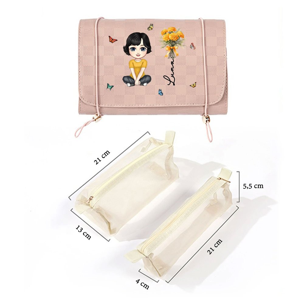 Vous pouvez choisir la couleur du sac parmi les options suivantes : rose, marron moka, blanc abricot et noir élégant. Personnalisez un personnage de bande dessinée qui vous ressemble ou qui ressemble au destinataire. Ajoutez une fleur de naissance correspondant au mois et saisissez un nom. Ce niveau de personnalisation transforme le sac en un indispensable de voyage unique qui reflète la personnalité et célèbre l'individualité.