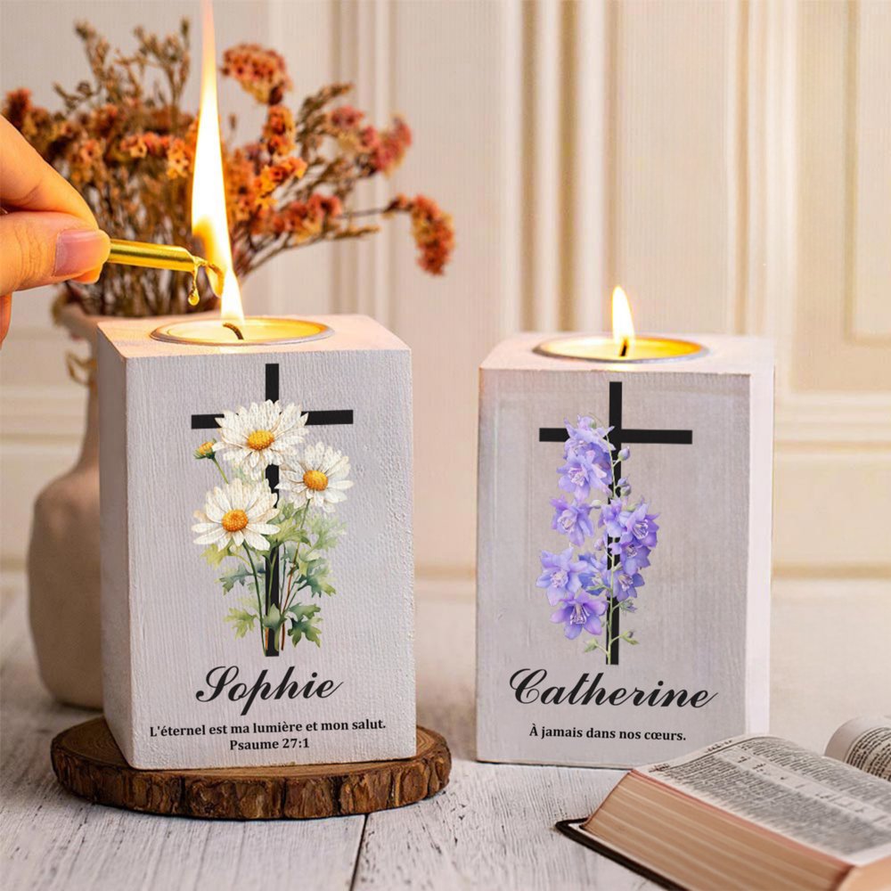 La croix, symbole du christianisme, est imprimée solennellement sur le bougeoir, soulignant la foi dévote. L'ajout de motifs de fleurs de naissance ajoute une touche unique, chaque fleur représentant une signification et une bénédiction différentes. Vous pouvez librement choisir un verset biblique et imprimer votre propre nom pour faire de ce bougeoir un objet unique.