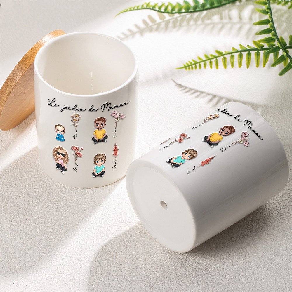 Notre pot de fleurs en céramique personnalisé est un cadeau réconfortant qui allie parfaitement un dessin animé adorable et les fleurs d'anniversaire. Il crée ainsi un cadeau unique et attentionné, parfait pour les mamans et les grands-mères. Vous pouvez personnaliser 1 à 4 personnages pour représenter les membres de la famille, une manière sincère d'exprimer votre appréciation et votre amour envers ces figures maternelles spéciales dans nos vies.