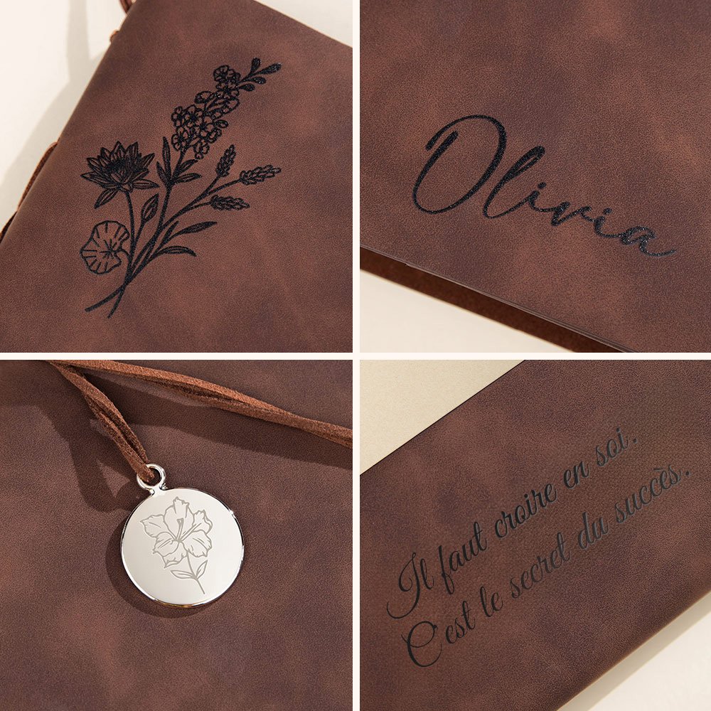 Avec ses motifs minimalistes de fleurs de naissance au trait, il confère à ce journal une beauté simple et élégante. La couverture en cuir, le pendentif en forme de feuille et l'étiquette ronde en métal capturent l'essence de l'esthétique rétro. Nous proposons 7 couleurs de couverture, et vous pouvez choisir en fonction de vos préférences. Il peut également être personnalisé avec votre nom pour montrer votre personnalité unique.
