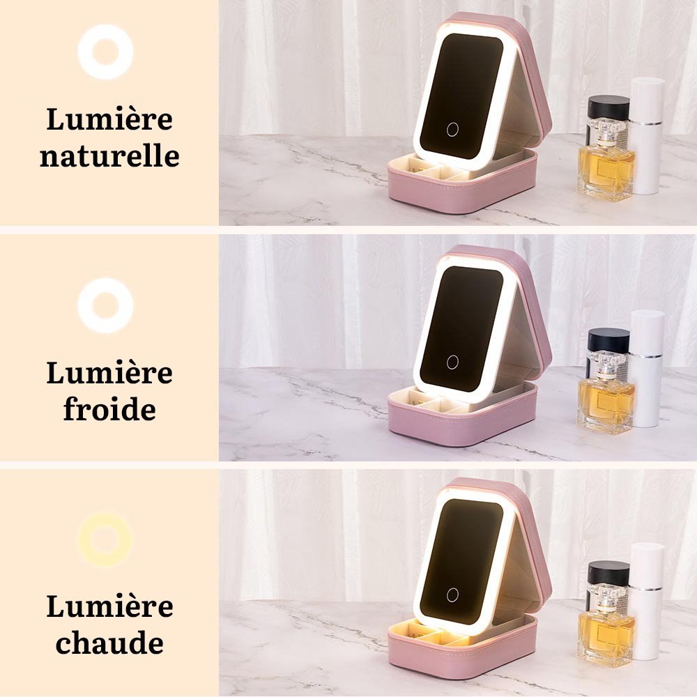 Cette boîte à bijoux est équipée d'un miroir LED avec trois réglages de couleur - lumière chaude, lumière naturelle et lumière froide - qui peuvent être utilisés pour créer différentes ambiances. Il est livré avec un câble de chargement, qui peut être utilisé pendant environ une semaine avec une seule charge. Que vous vous prépariez pour une soirée ou une journée décontractée, choisissez la lumière qui vous convient le mieux. Ce miroir pratique est parfait pour se maquiller et vérifier son look.