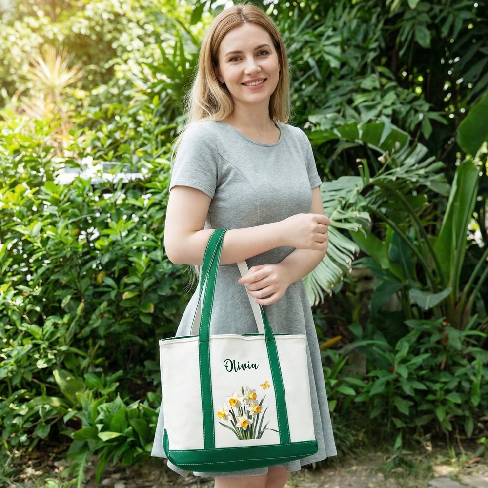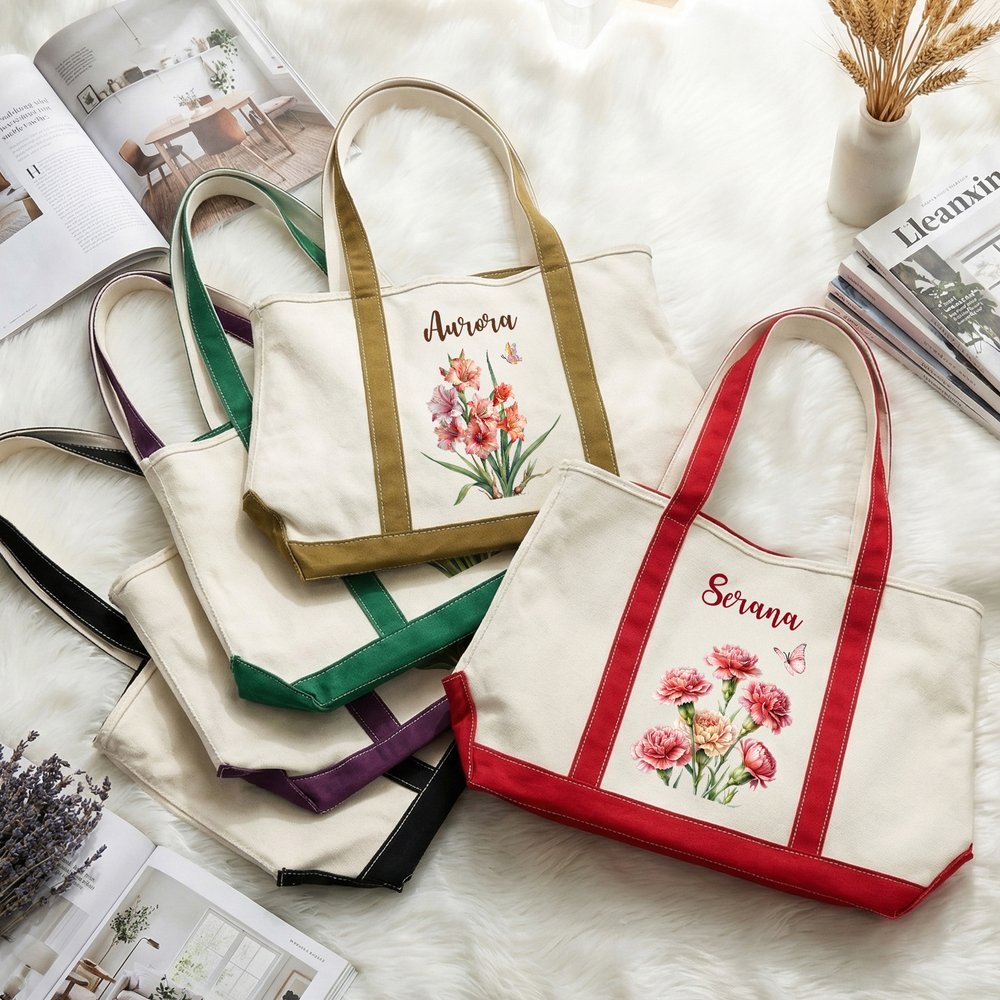 Ce sac fourre-tout présente une esthétique fraîche et botanique avec de délicates illustrations de fleurs de naissance dessinées à la main, chacune associée à un nom personnalisé fluide. La base en toile neutre est rehaussée par des bordures contrastées dans des tons riches, créant ainsi un look classique et sophistiqué. Le design général est minimaliste mais élégant, équilibrant le charme naturel et la fonctionnalité moderne.