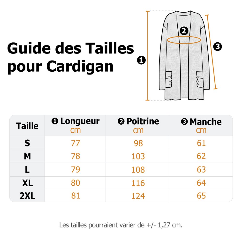 | Mesure: | S, M, L, XL, 2XL En raison de l'extensibilité des matières tricotées, les mesures sont données à titre indicatif. |