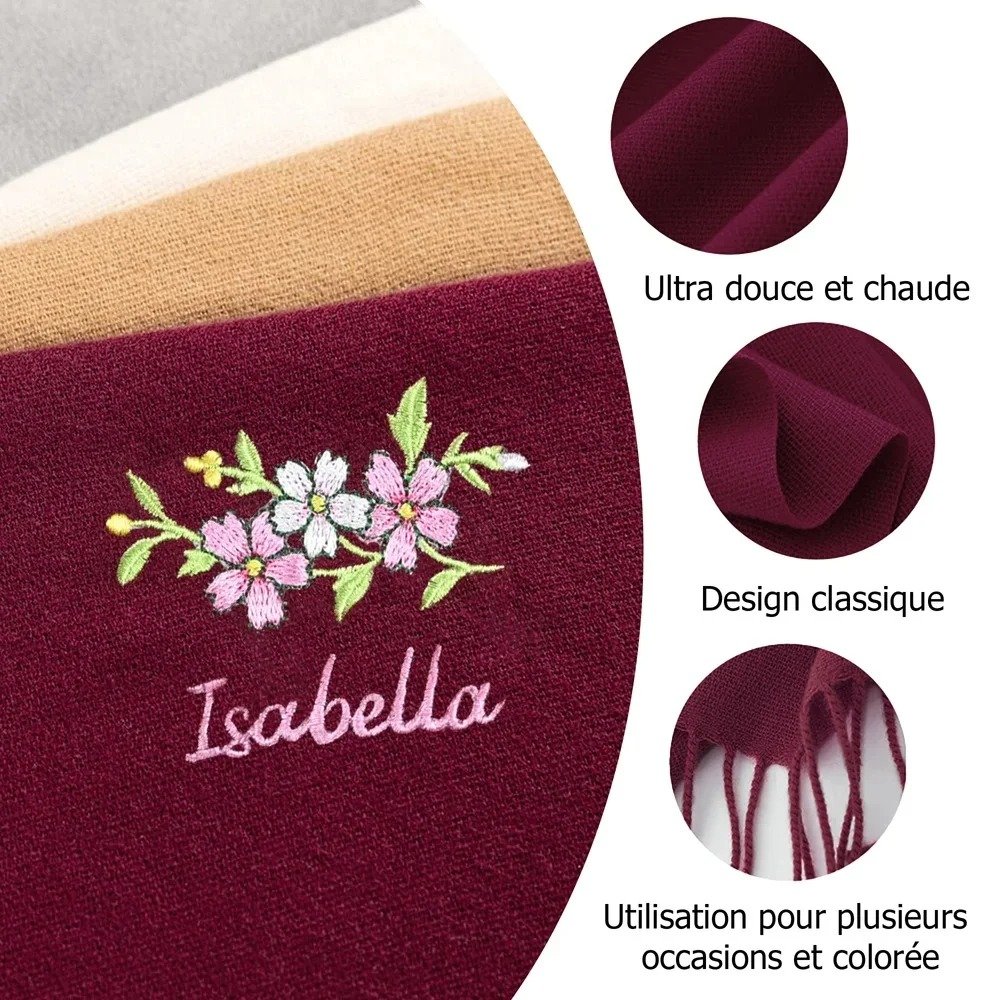 Il permet 12 combinaisons personnalisées de fleurs et de noms de naissance, et offre un choix de 8 couleurs de foulard. Le design exclusif élève le foulard au-delà d'un simple accessoire, en l'adaptant précisément à l'esthétique personnelle et en en faisant une vitrine de l'individualité et du goût.