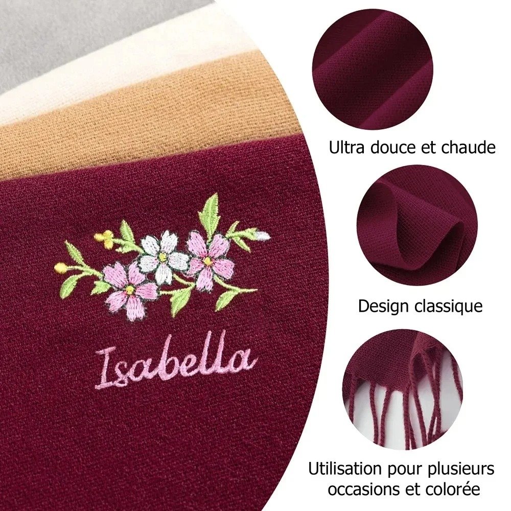 Il permet 12 combinaisons personnalisées de fleurs et de noms de naissance, et offre un choix de 8 couleurs de foulard. Le design exclusif élève le foulard au-delà d'un simple accessoire, en l'adaptant précisément à l'esthétique personnelle et en en faisant une vitrine de l'individualité et du goût.