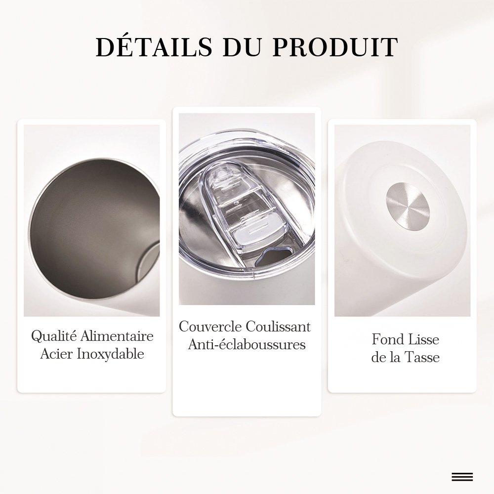 Fabriqué en acier inoxydable 304 de haute qualité, le gobelet a une construction solide et durable qui résiste aux taches et aux odeurs pour que vos boissons soient toujours fraîches et savoureuses. De plus, sa double couche isolante maintient votre boisson à la température optimale, garantissant que la saveur de votre boisson reste parfaite, sans être affectée par les changements de température.