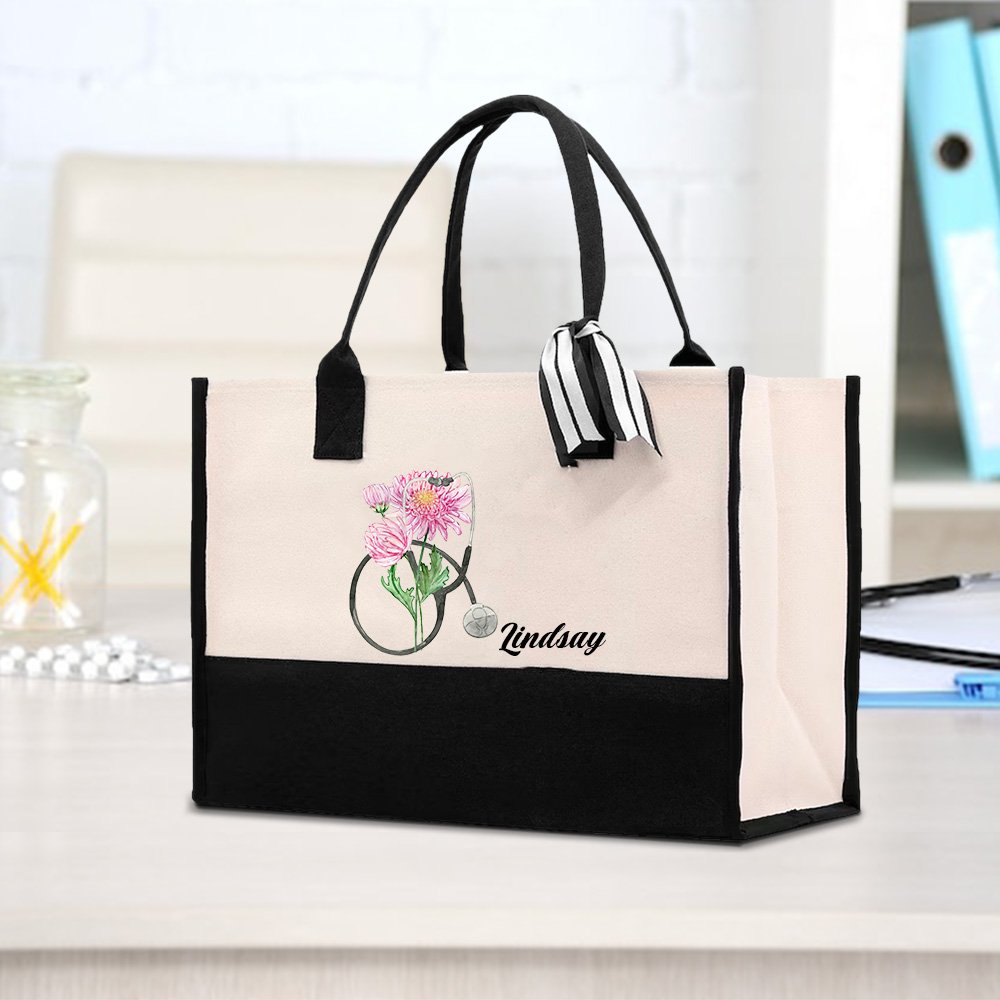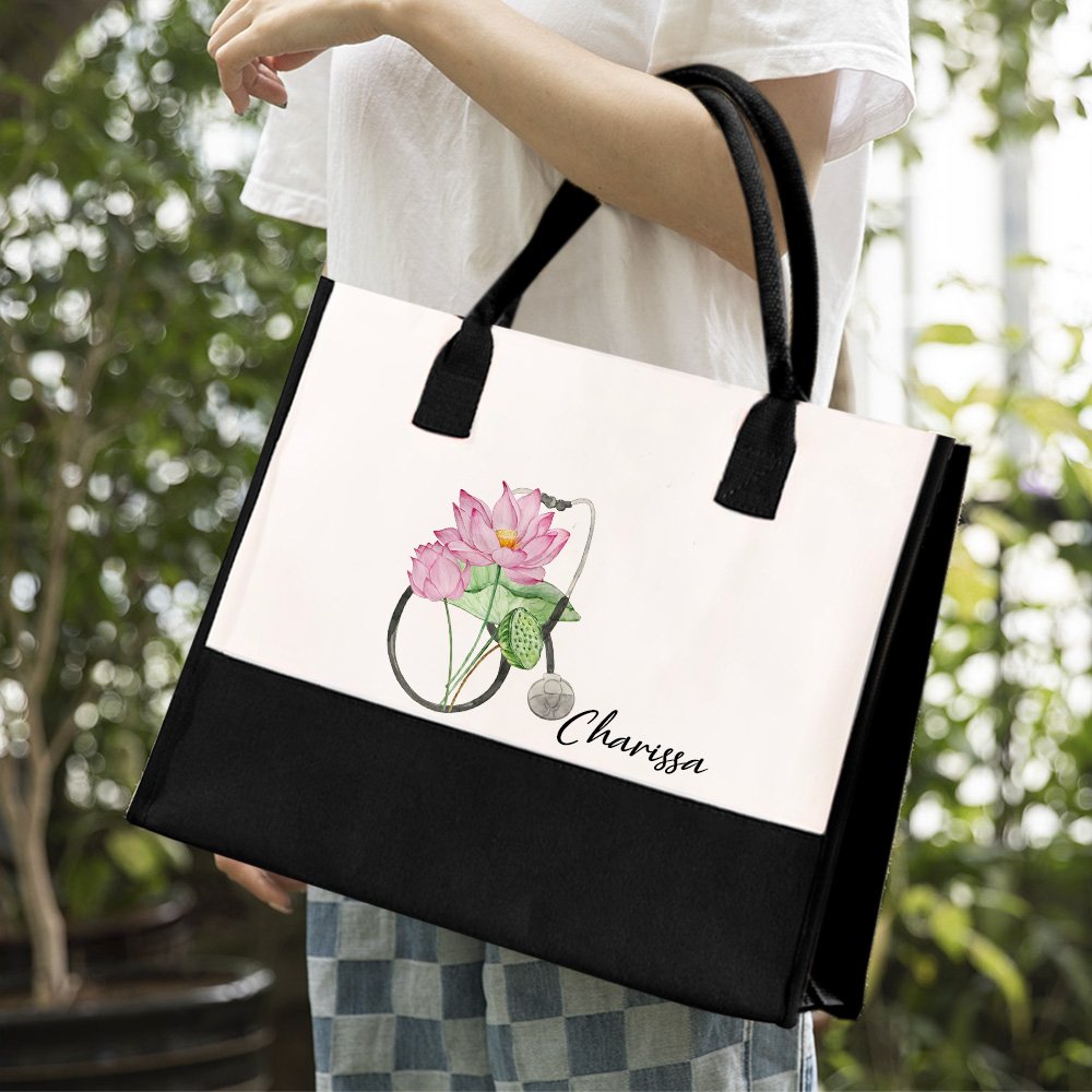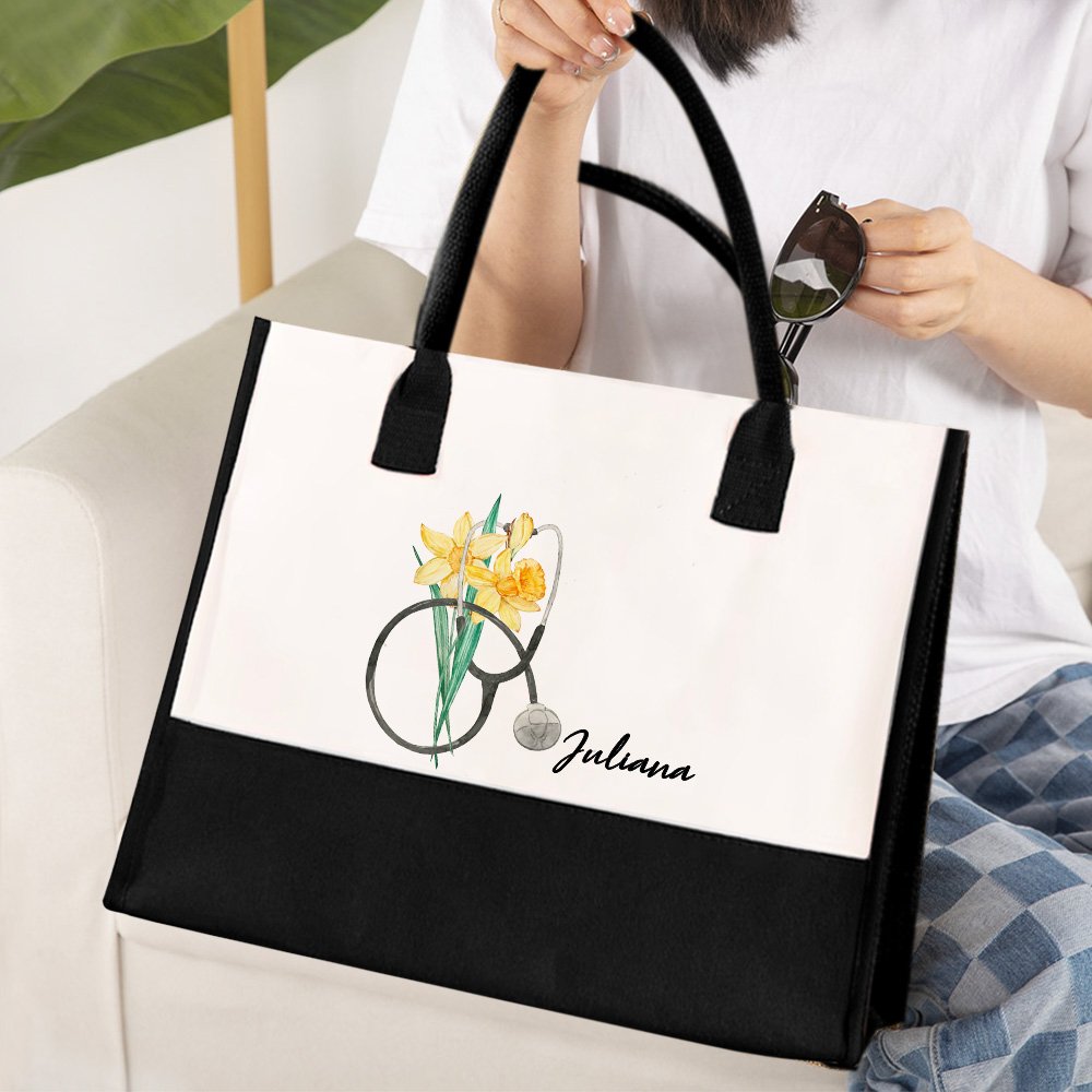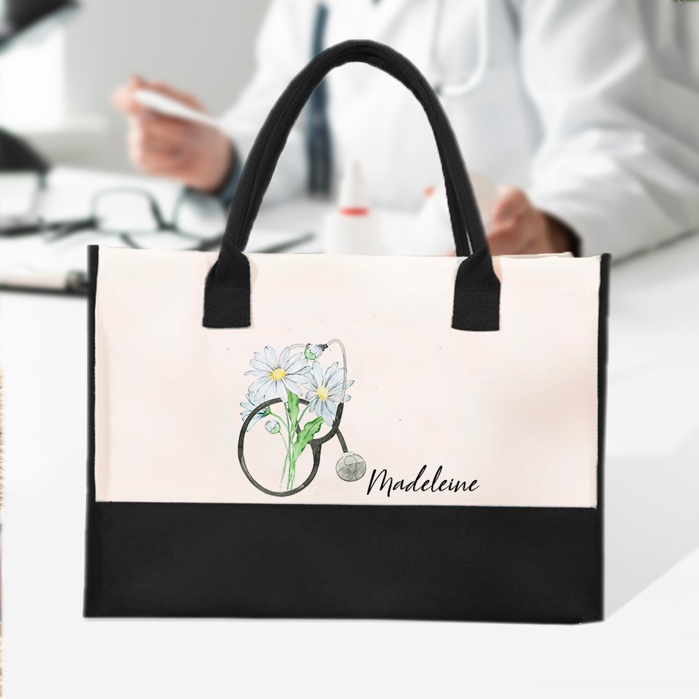 Le sac est imprimé avec des fleurs d'anniversaire et des motifs de stéthoscope, il est simple et charmant. Le sac peut également être personnalisé avec votre nom, ce qui permet d'ajouter votre marque unique au sac.