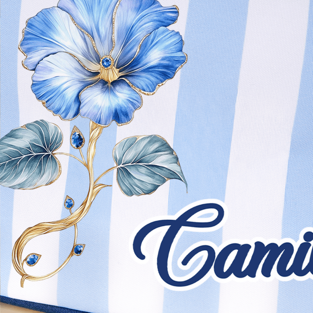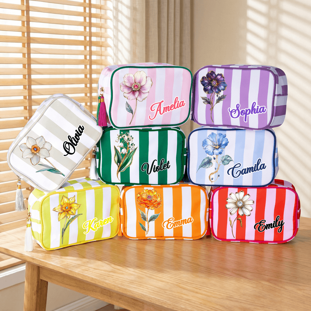 Cette trousse de maquillage est ornée d'un motif à rayures colorées et d'une breloque en forme de houppe. Elle peut être personnalisée avec une fleur de naissance et un nom, alliant ainsi le langage des fleurs à une esthétique personnalisée. Elle sert à la fois de pochette de rangement pratique et d'accessoire de mode qui exprime un style personnel.