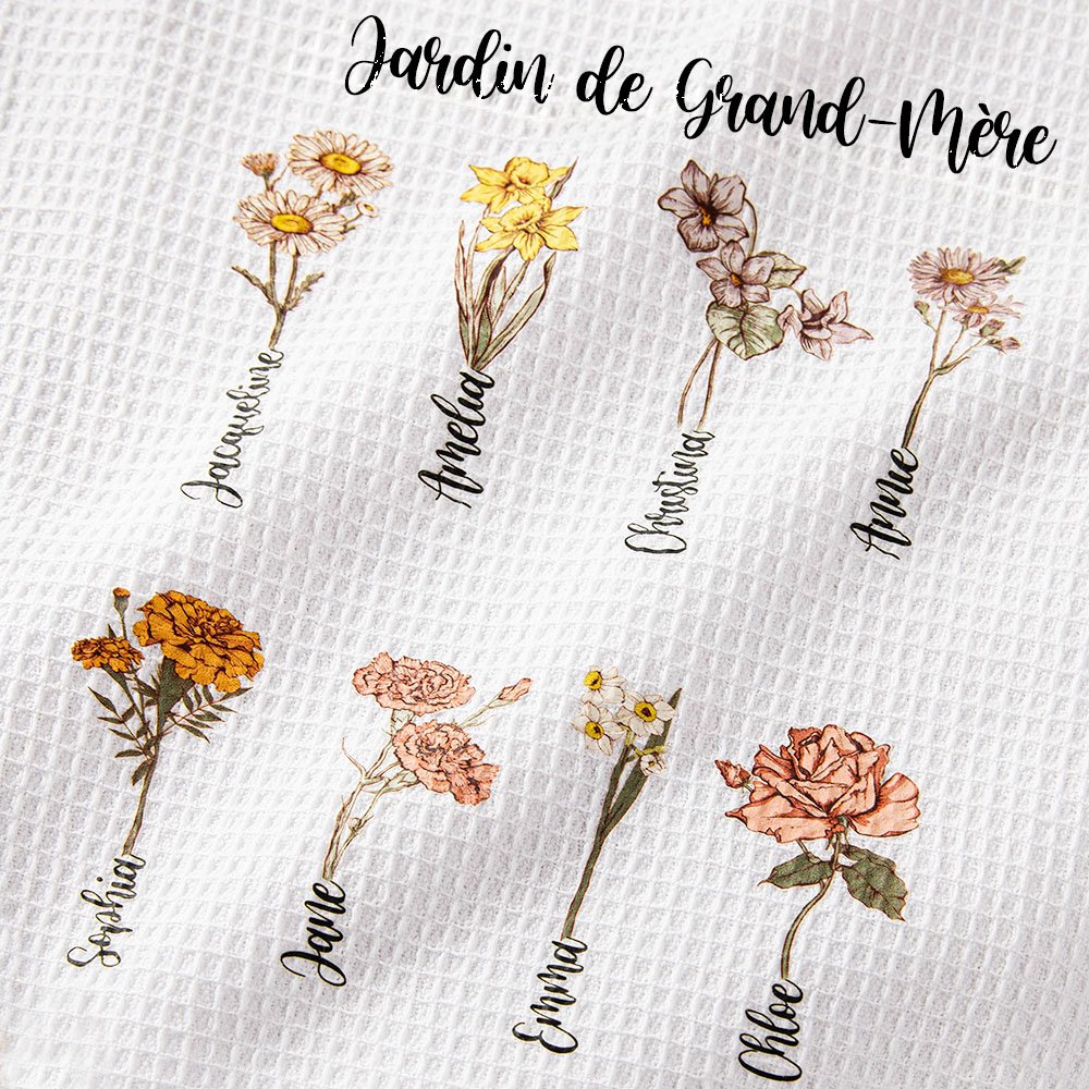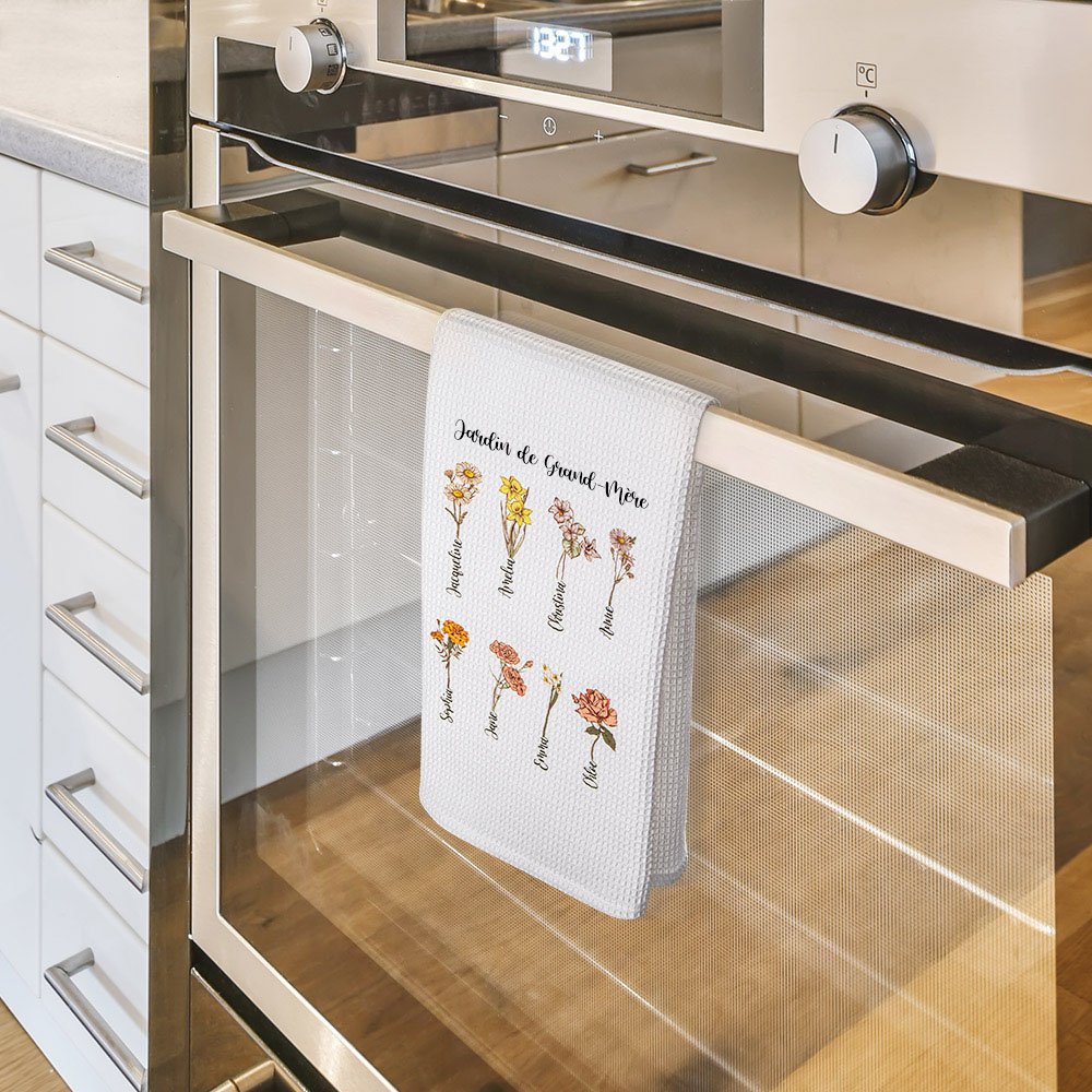 Chaque torchon peut être personnalisé avec 1 à 15 fleurs de naissance, ce qui en fait un cadeau unique et spécial. Les couleurs vives et les détails complexes du motif floral sont magnifiquement mis en valeur sur le tissu blanc, créant ainsi un accessoire de cuisine personnalisé et visuellement saisissant.
