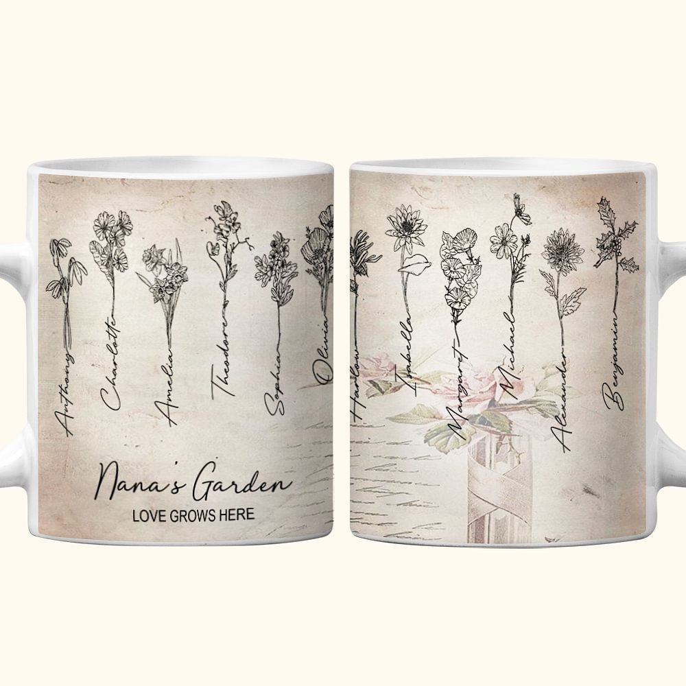 Mug en Céramique Personnalisé avec Titre Noms Fleurs de Naissance Tasse de Style Vintage Cadeau Fête des Mère pour Maman Grand-Mère