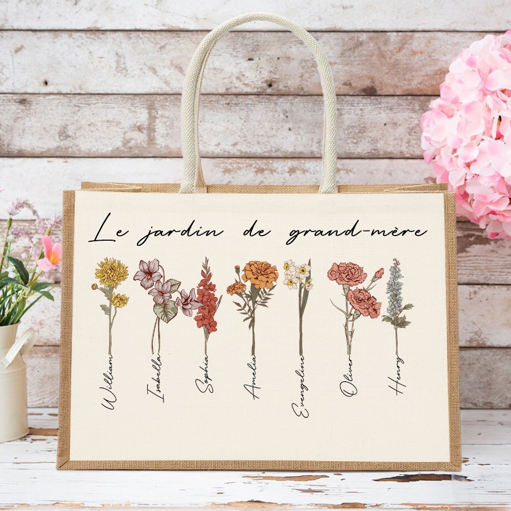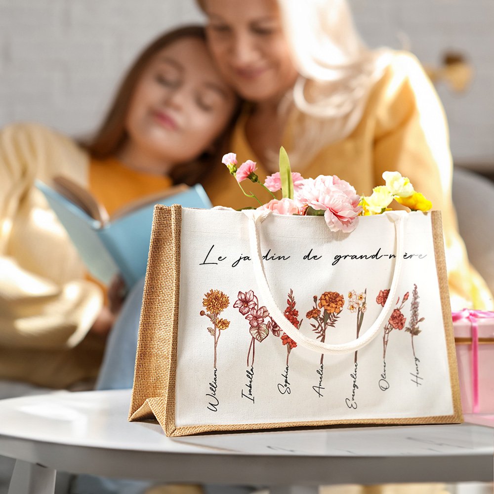 Notre sac fourre-tout exquis présente un superbe motif de fleurs de naissance, où chaque fleur représente le mois de naissance d'un enfant. Les sacs personnalisés expriment l'amour et l'admiration pour les mères ou les grands-mères, créant ainsi un cadeau unique et significatif.