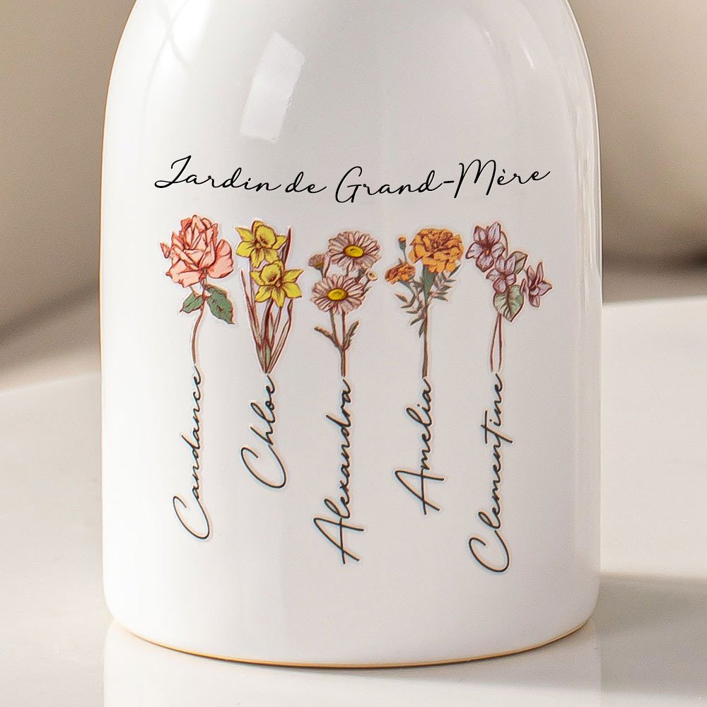 Notre vase exquis en céramique avec des fleurs de naissance est un cadeau unique et sincère pour la fête des mères. Le vase est imprimé avec des fleurs de naissance de style vintage, et vous pouvez personnaliser de 1 à 20 fleurs de naissance et les noms correspondants de chaque membre de la famille pour exprimer votre gratitude envers votre mère ou votre grand-mère.