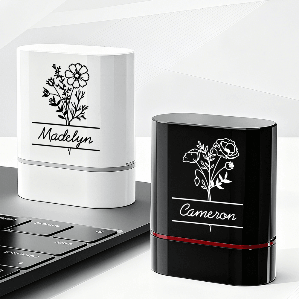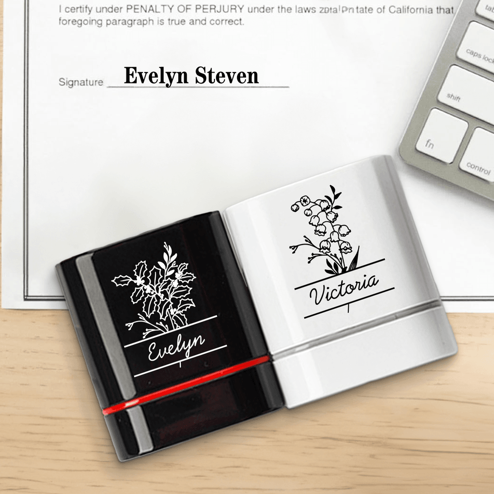 Unissant avec art votre nom unique à la fleur de naissance de votre mois, reflet intemporel de votre caractère personnel, ce tampon signature les capture tous deux dans un travail de ligne délicat sur une surface noire brillante. Le motif floral vibrant s'entrelace gracieusement avec votre nom, alliant l'élégance organique et l'expression de soi en un seul accessoire raffiné et compact.