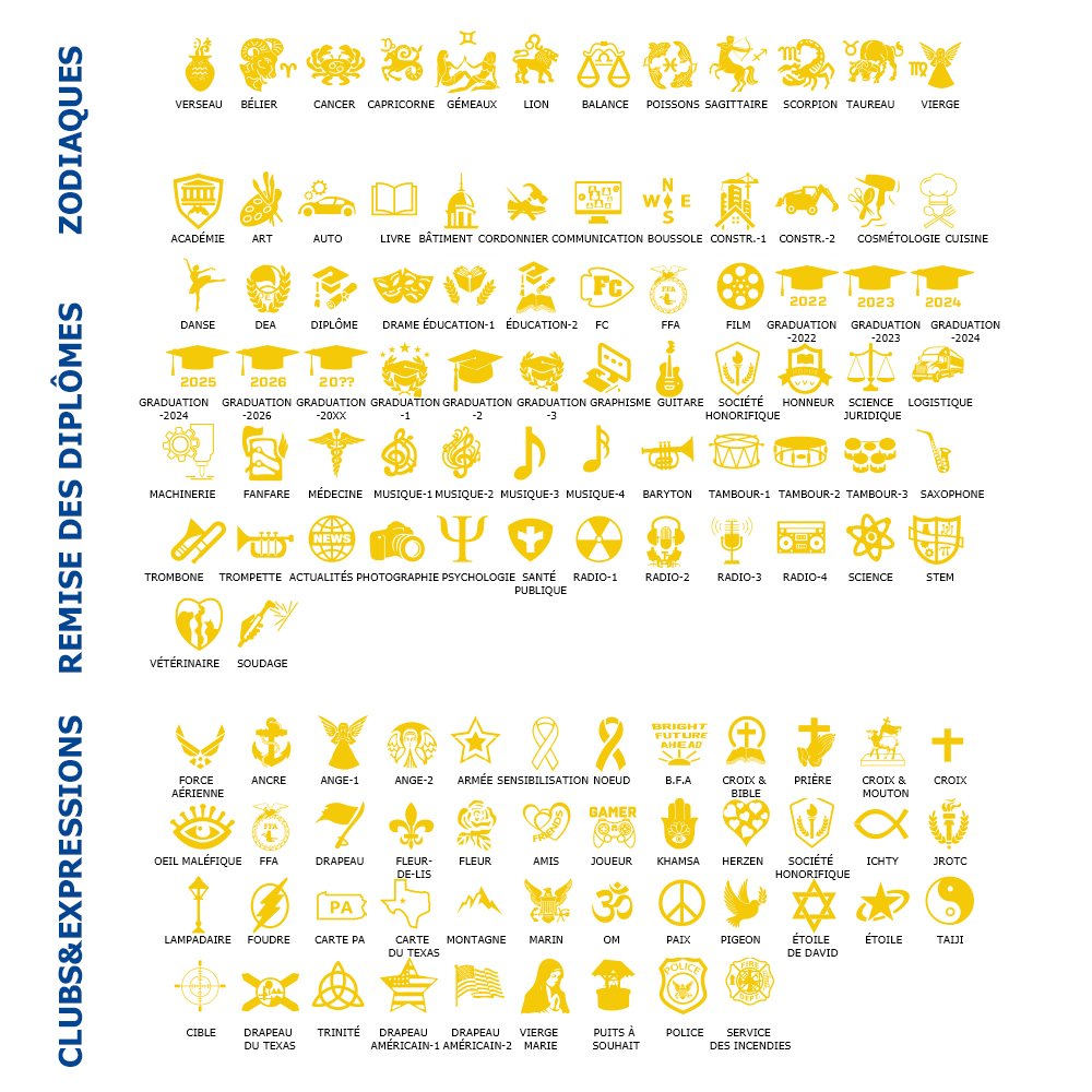 Avec plus de 200 badges disponibles, allant des mascottes aux sports, en passant par le zodiaque, la remise des diplômes, les clubs et les expressions, vous disposez d'un large éventail de styles. Trouvez l'emblème parfait qui représente vos passions, vos intérêts ou vos activités extrascolaires, et créez un anneau de classe vraiment personnalisé.