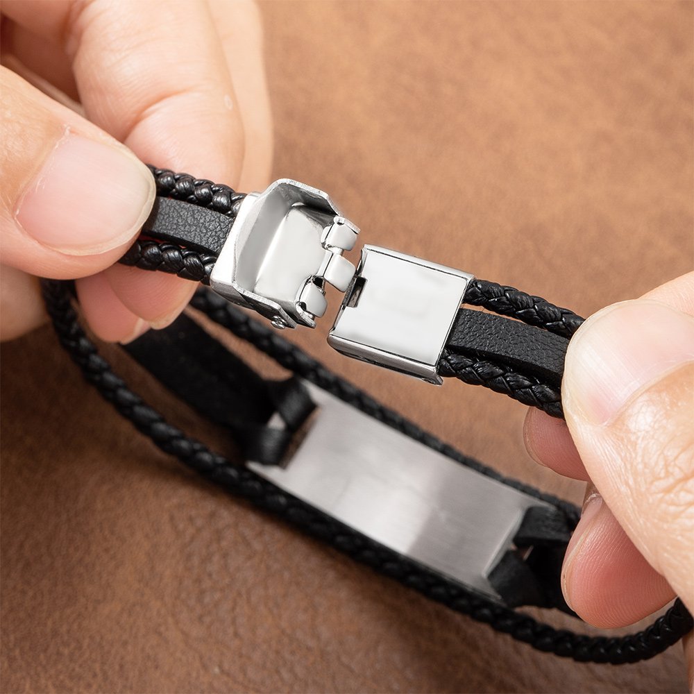 Le bracelet en cuir pour hommes est un excellent moyen d'exprimer votre gratitude et votre amour pour votre personne spéciale. Vous pouvez choisir le motif poing ou pied et les mots inspirants sur la barre en acier inoxydable, de plus, les noms gravés sur le métal en acier inoxydable peuvent montrer votre amour ou vos remerciements pour le père. Ce bracelet constitue un accessoire quotidien parfait pour les hommes.