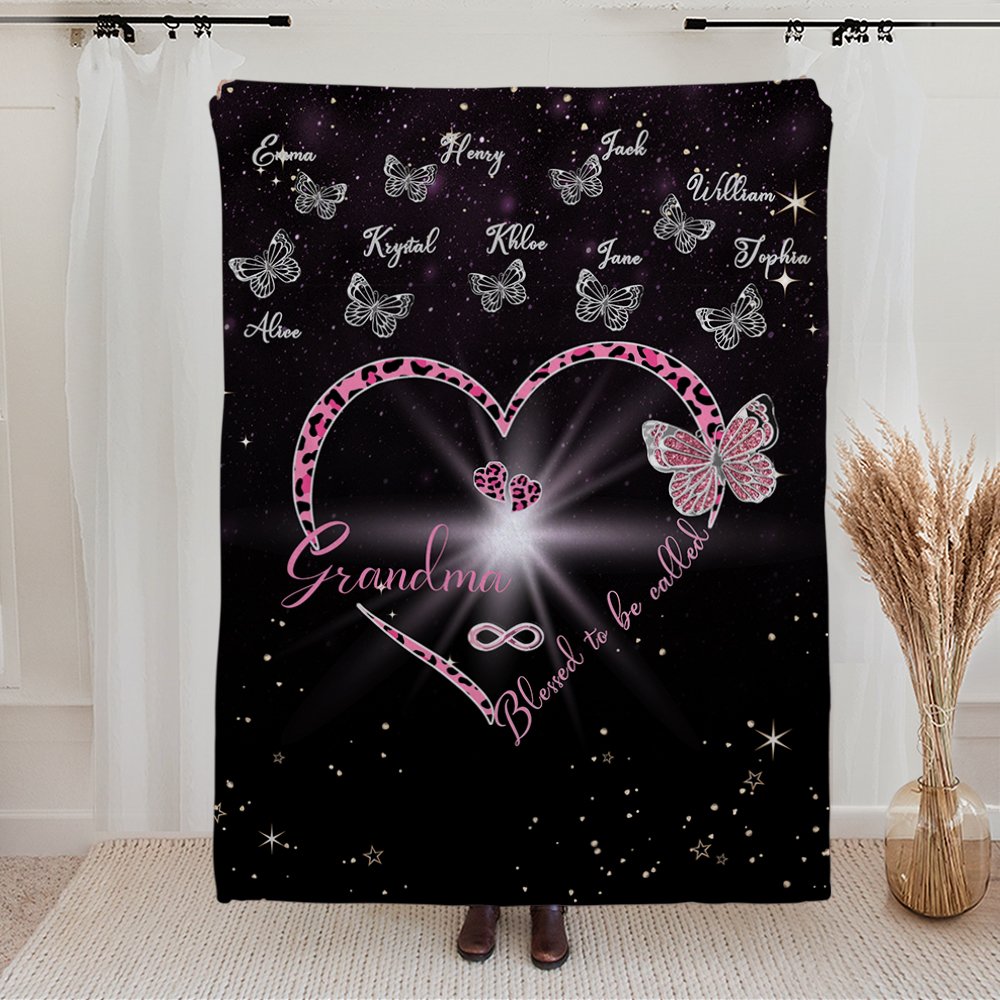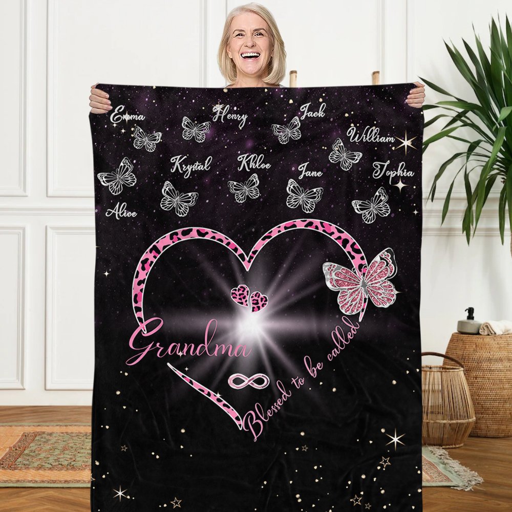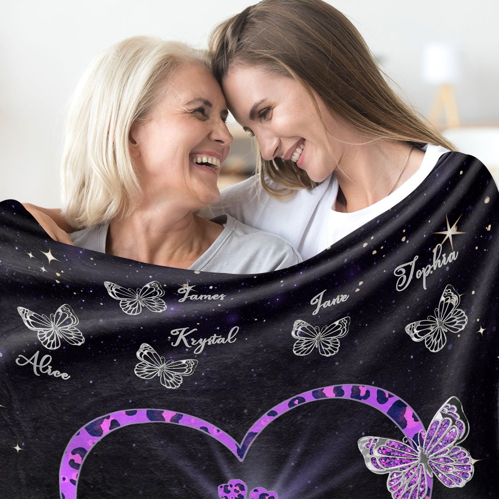 La couverture papillon en forme de cœur présente un énorme cœur papillon de maman ou de grand-mère ainsi que 1 à 9 petits papillons qui peuvent être personnalisés avec des noms. C'est un choix idéal pour votre mère ou votre grand-mère à l'occasion de Noël ou de la fête des mères.