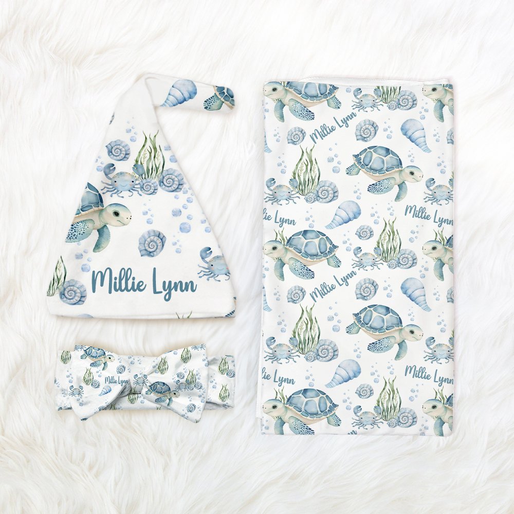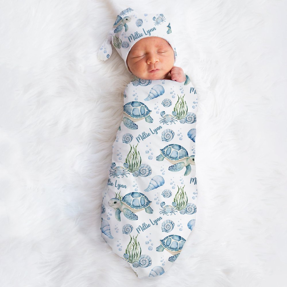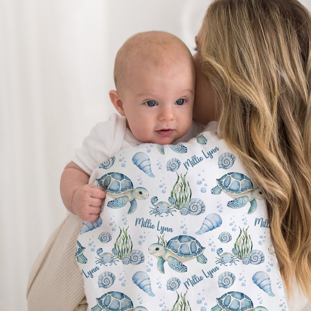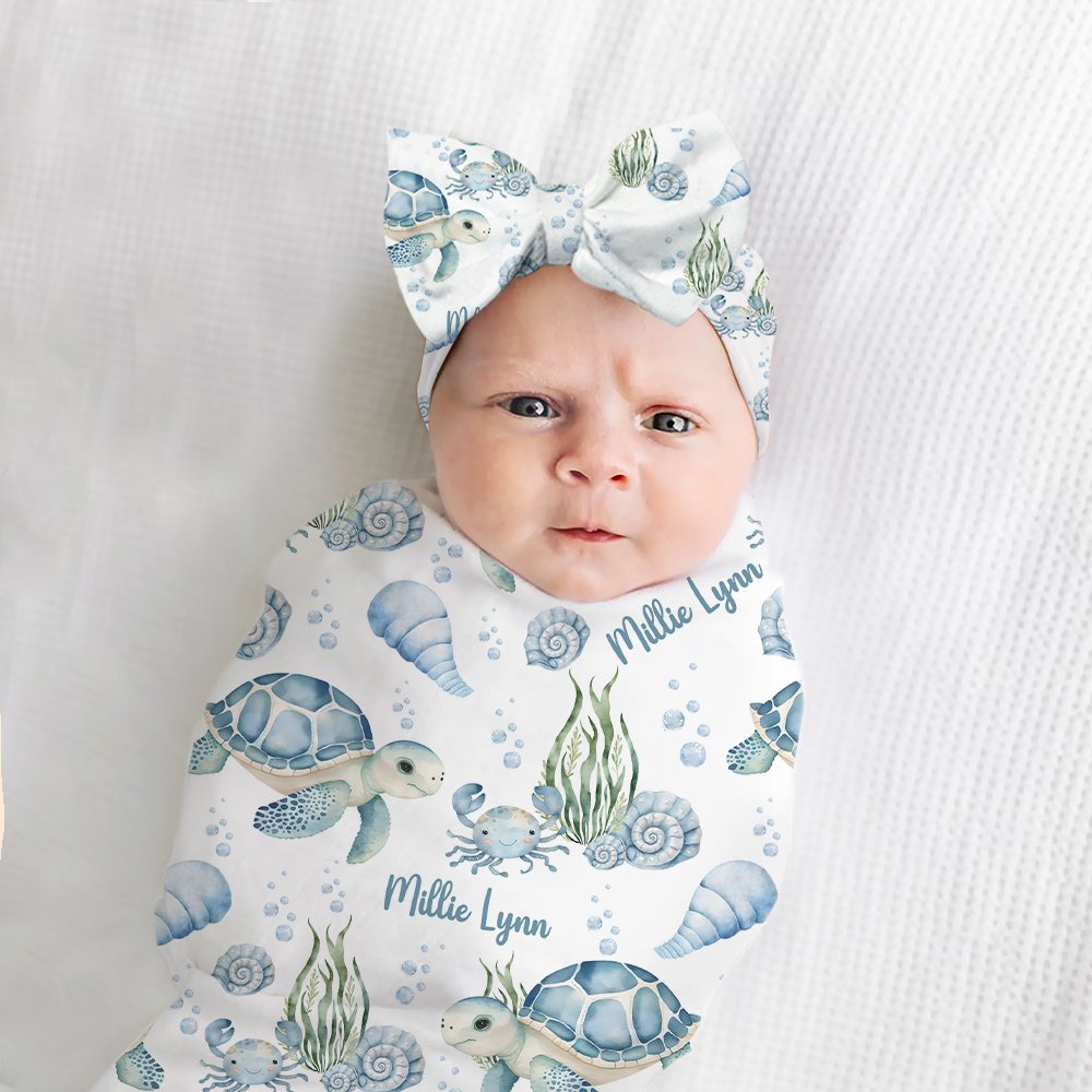 Le thème de notre couverture emmaillotée est le paradis bleu de l'océan, avec de jolies tortues, des conques, des algues et diverses créatures marines vivantes. Vous pouvez également personnaliser le nom du bébé pour ajouter un sentiment de chaleur, faisant de ce cadeau un souvenir précieux.