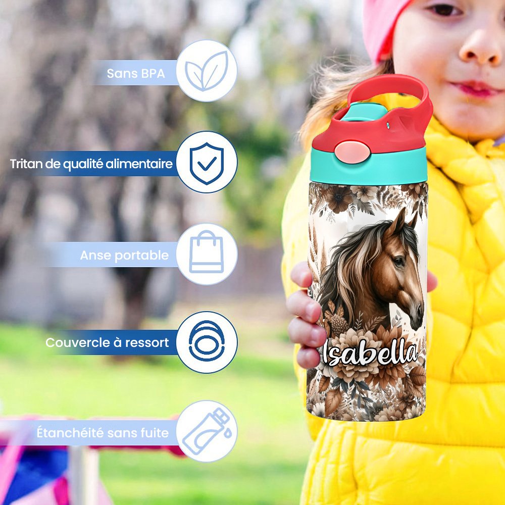 Nos gourdes sont conçues avec des éléments de chevaux réalistes et des fleurs de la même couleur, ce qui est très bohème. Vous pouvez y ajouter le nom de votre enfant pour ajouter un élément unique et personnalisé à ses bouteilles d'eau. Laissez les enfants ressentir un sentiment d'appartenance et de fierté à l'égard de leurs affaires.