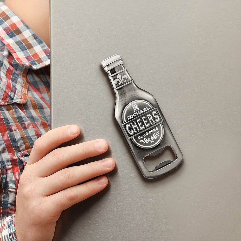 Ces décapsuleurs en forme de bouteille en bas-relief sont d'excellentes idées de cadeaux de mariage pour vos invités amateurs de bière. La gravure "CHEERS" vise à célébrer la joie du mariage ; l'initiale sur le dessus représente la personne ; vous pouvez également personnaliser le rôle (par exemple, témoin, garçon d'honneur) et la date. Ce sont des souvenirs parfaits et des cadeaux pratiques pour les invités de votre mariage.