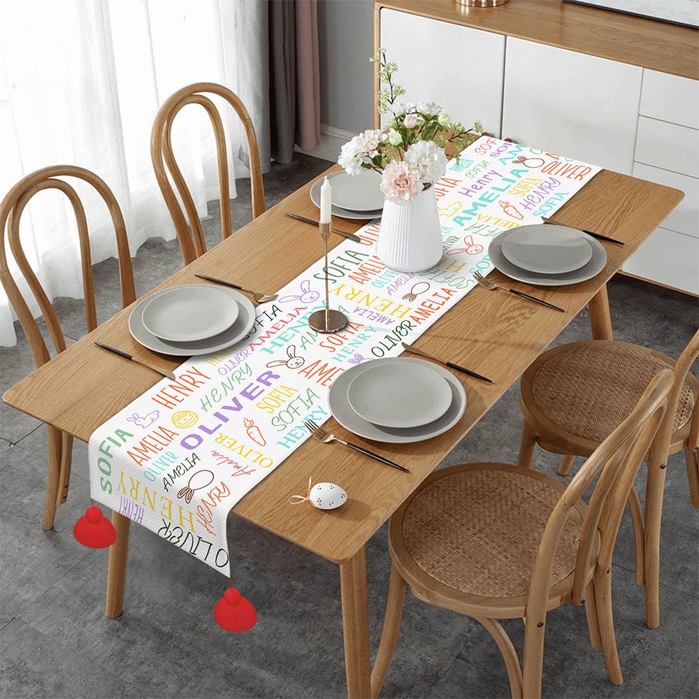 Ce chemin de table présente un charmant nuage de mots qui mêle astucieusement des noms à des images de lapins, d'œufs, de carottes, etc. Le design astucieux crée une pièce visuellement frappante qui invite à regarder de plus près et suscite la conversation. Le nuage de mots peut être personnalisé avec les noms des membres de la famille, faisant de chaque chemin de table un souvenir unique.