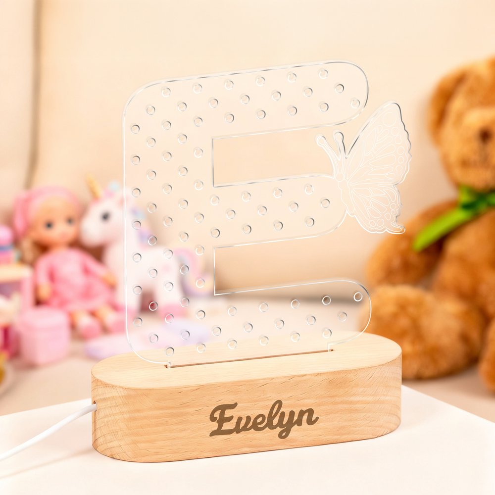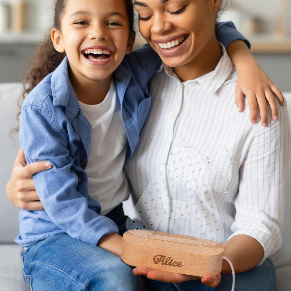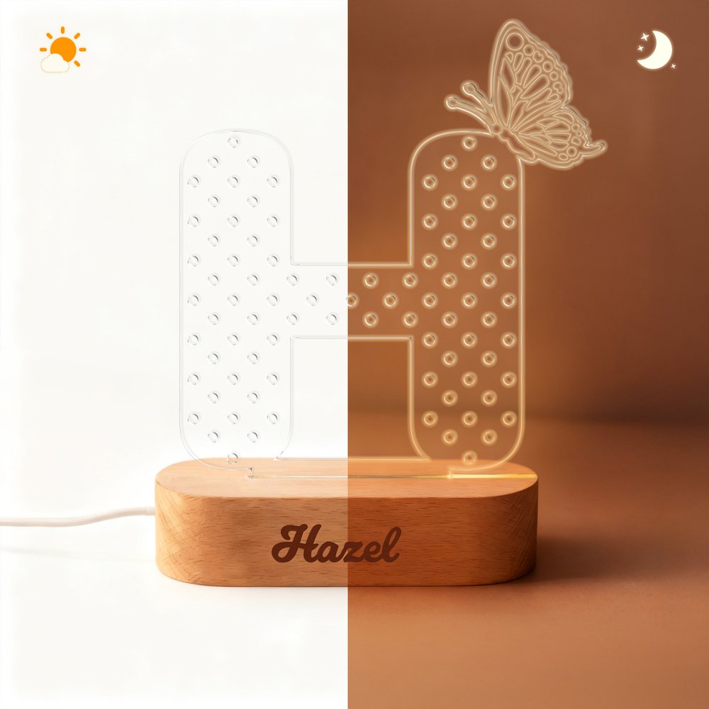 Fabriquée en acrylique de haute qualité et en bois de hêtre, cette veilleuse est durable et élégante. Le panneau en acrylique fait l'objet d'un traitement précis, ce qui garantit la netteté et la durabilité de la forme de la lettre, du motif du papillon et des détails. La base en bois de hêtre, robuste et écologique, offre une assise stable. La douce lueur des diodes électroluminescentes (DEL) est agréable pour les yeux, ce qui en fait un objet idéal pour une utilisation nocturne.