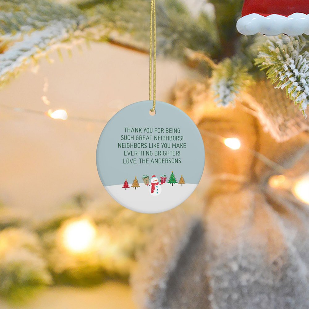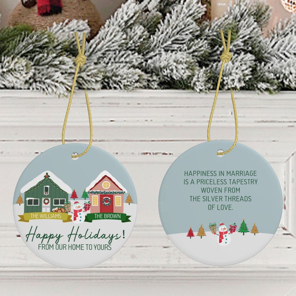 Cet ornement en céramique représente un charmant bonhomme de neige sur fond de cabane, personnalisé avec deux noms de famille. La combinaison du thème de l'hiver et de la personnalisation représente de manière unique votre famille ou votre amitié. Chaque ornement devient un souvenir unique, célébrant le lien entre deux familles ou deux couples.