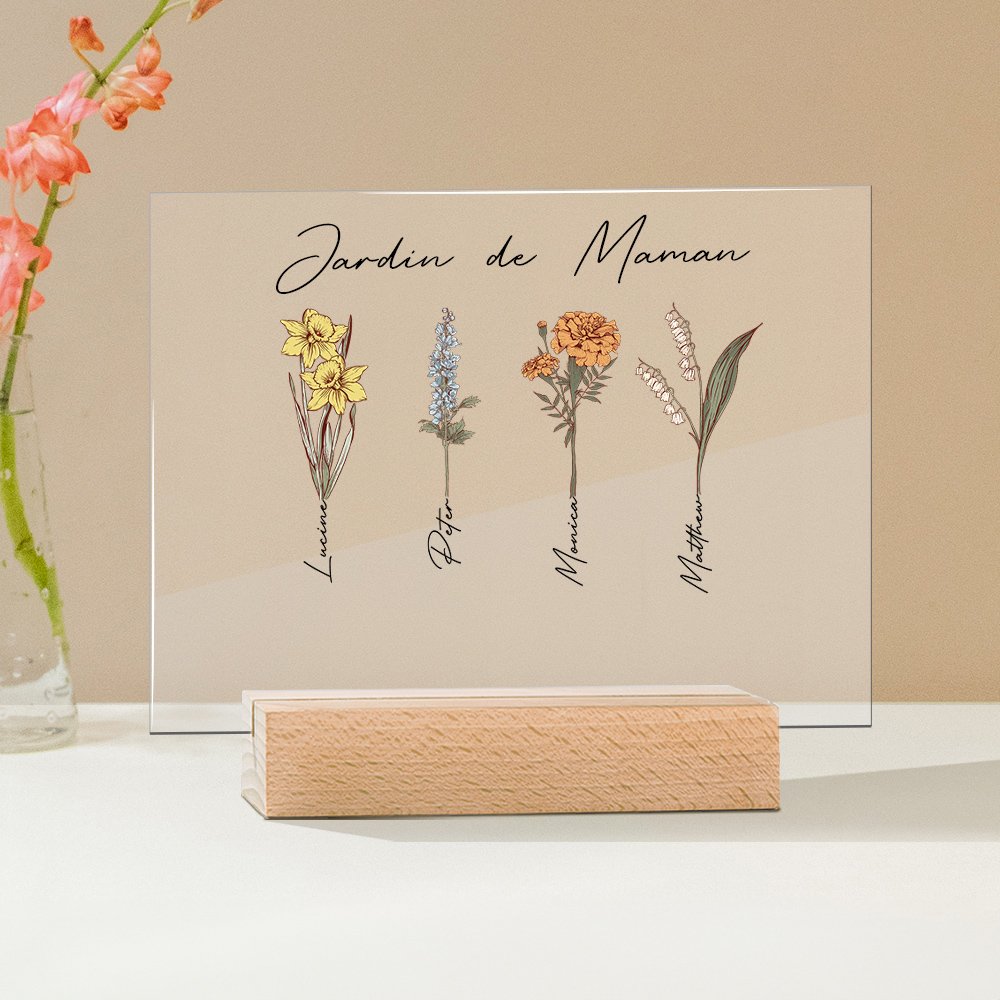 La plaque acrylique des fleurs de naissance vous permet de personnaliser le titre et de 1 à 20 fleurs de naissance et noms différents. Chaque fleur représente le mois de naissance d'un membre de la famille, ce qui en fait un cadeau unique et spécial.