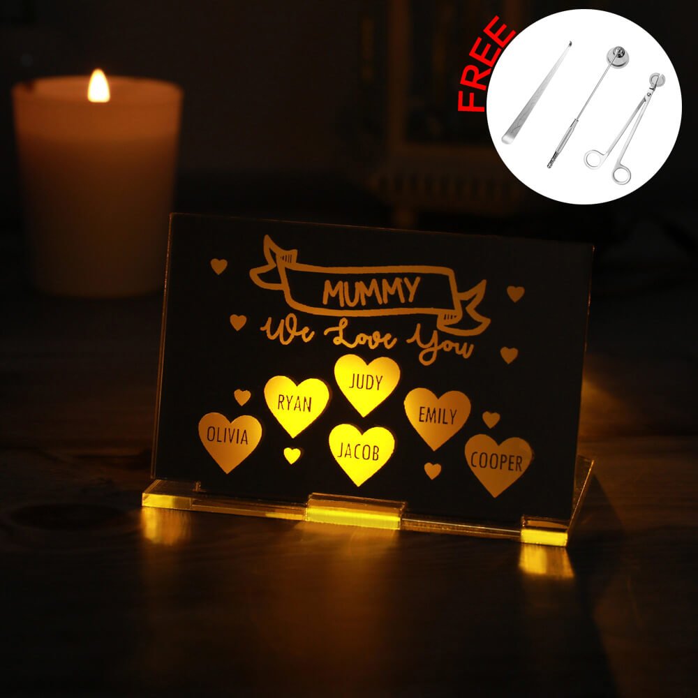• Conçu comme un cadeau spécial. Famille gavée sur le ruban, avec les prénoms personnalisés sur les cœurs. La nuit, les prénoms illuminés avec ce joli bougeoir, en tant que décoration d'intérieur, réchauffant ces moments passés en famille. Et le jour, décoration de votre maison comme un miroir. Matériau en plexiglas durable. Chaque bougeoir livré avec un éteignoir à bougie pour votre commodité.