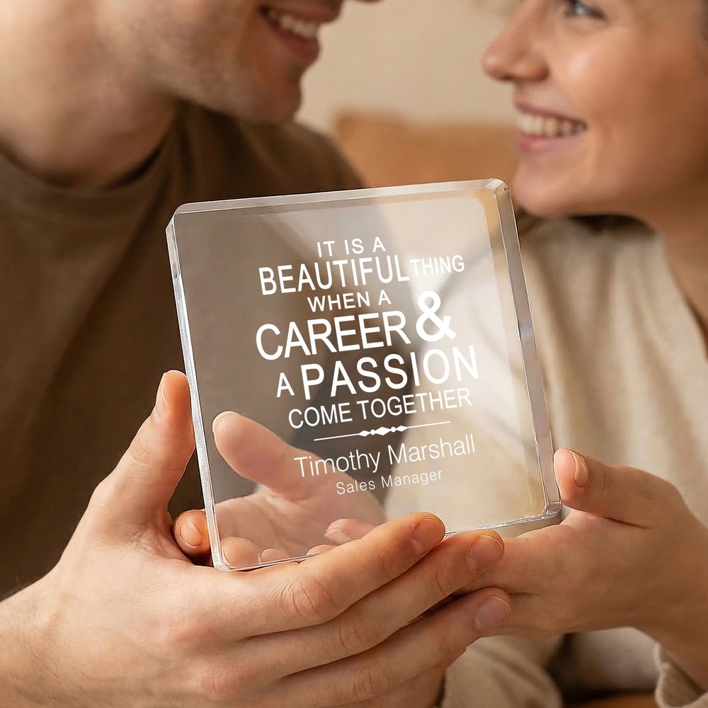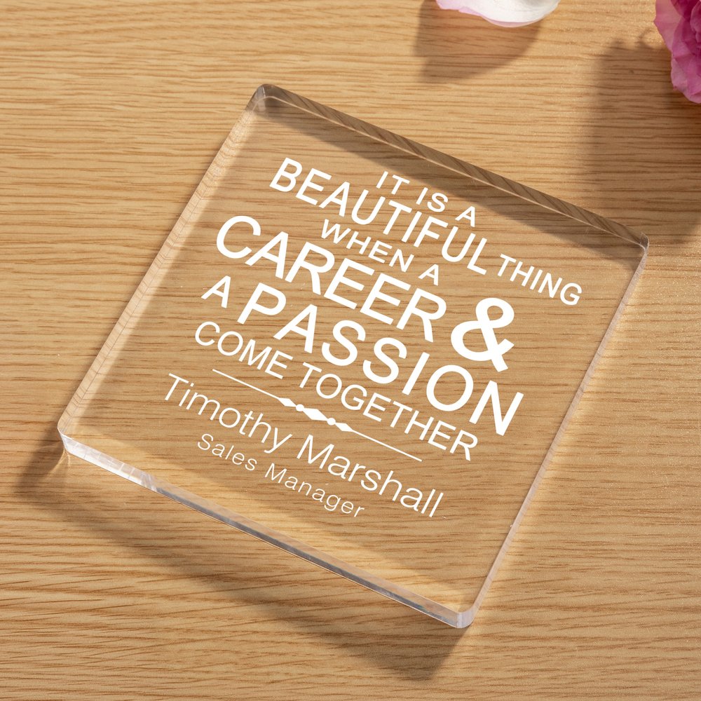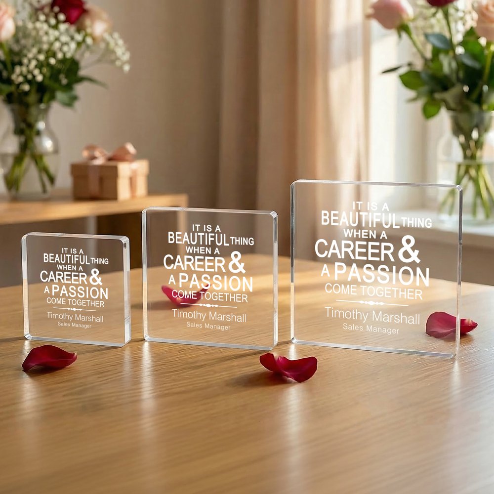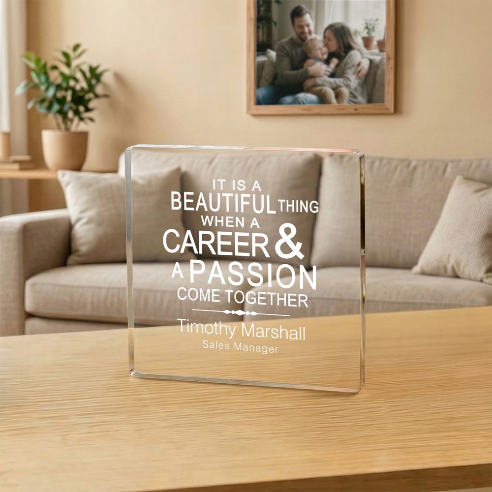 Avec "C'EST UNE BELLE CHOSE QU'UNE CARRIÈRE ET UNE PASSION SONT ENSEMBLE" comme énoncé motivationnel central, avec des signatures personnalisées, il transmet un concept de carrière positif. La forme carrée est à la fois simple et généreuse, avec une signification commémorative et une valeur décorative, soulignant la reconnaissance exclusive de l'excellence.
