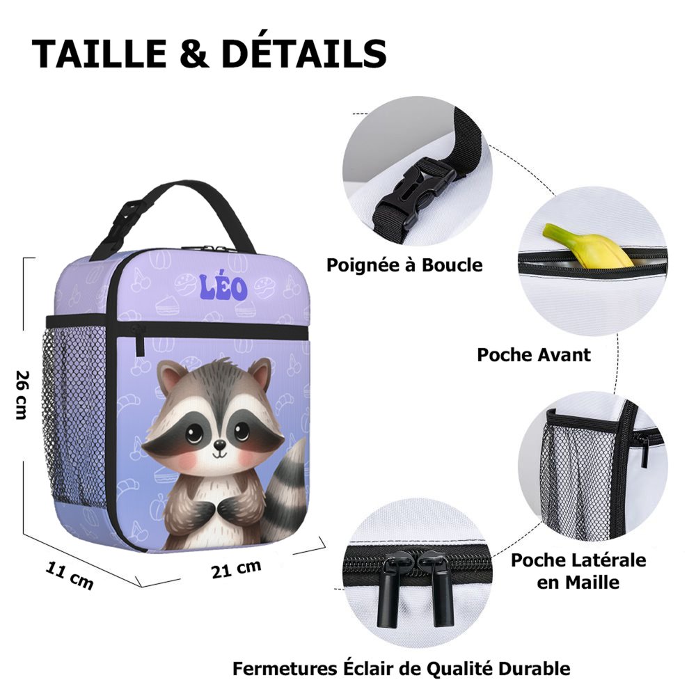 Ce sac à repas est orné de mignons animaux de dessins animés tels que des ratons laveurs, des hérissons, des koalas et des cerfs, créant ainsi une scène charmante et ludique. Vous pouvez choisir votre motif animalier préféré et le personnaliser avec le nom de votre enfant pour rendre le sac à lunch unique et vous assurer qu'il ne sera pas confondu dans les écoles ou les garderies.