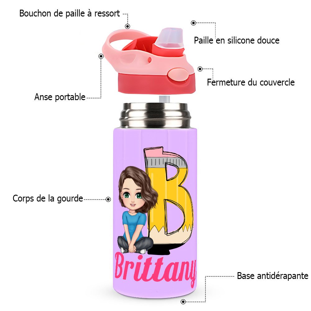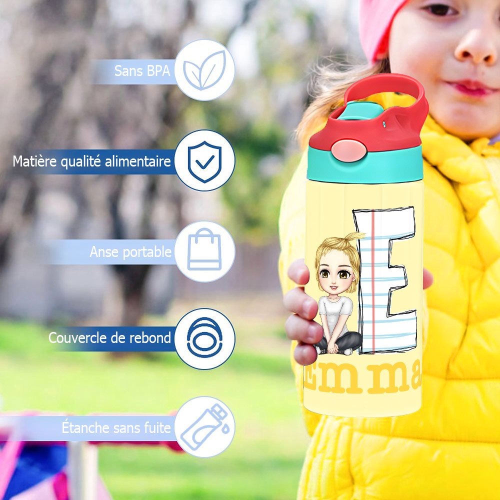 Cette bouteille d'eau est conçue avec un adorable personnage de dessin animé et une initiale personnalisable, faisant de chaque bouteille d'eau un objet spécial pour votre enfant. Vous avez le choix entre 5 initiales différentes, parmi lesquelles des crayons, des pommes, des règles ou des cahiers. Vous pouvez également personnaliser le nom de votre enfant sur la bouteille d'eau pour la rendre encore plus unique.
