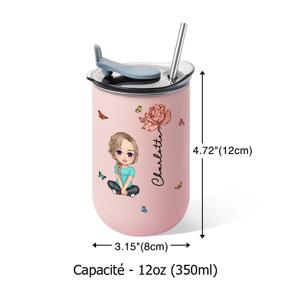Ce gobelet à café représente une jolie fille de dessin animé à côté de la fleur de naissance et du nom, ce qui en fait un cadeau unique et précieux pour les femmes.