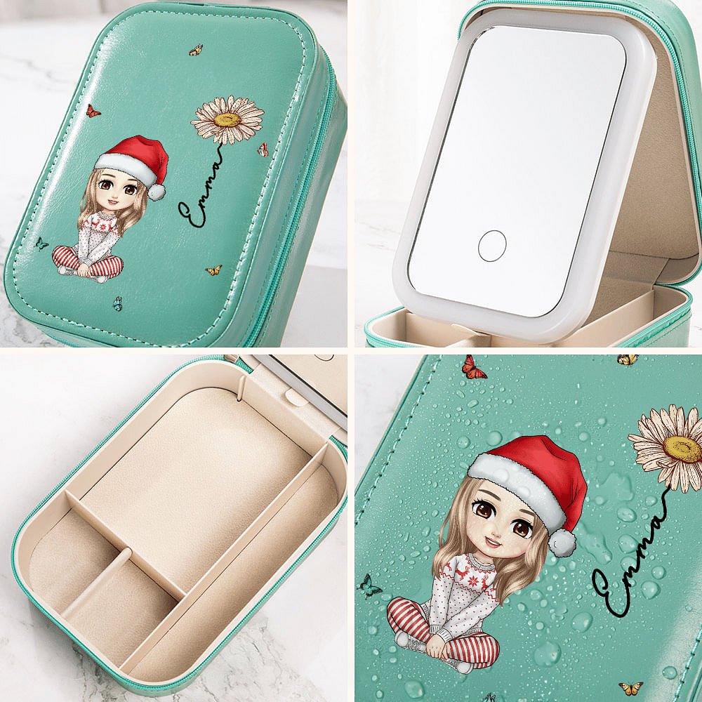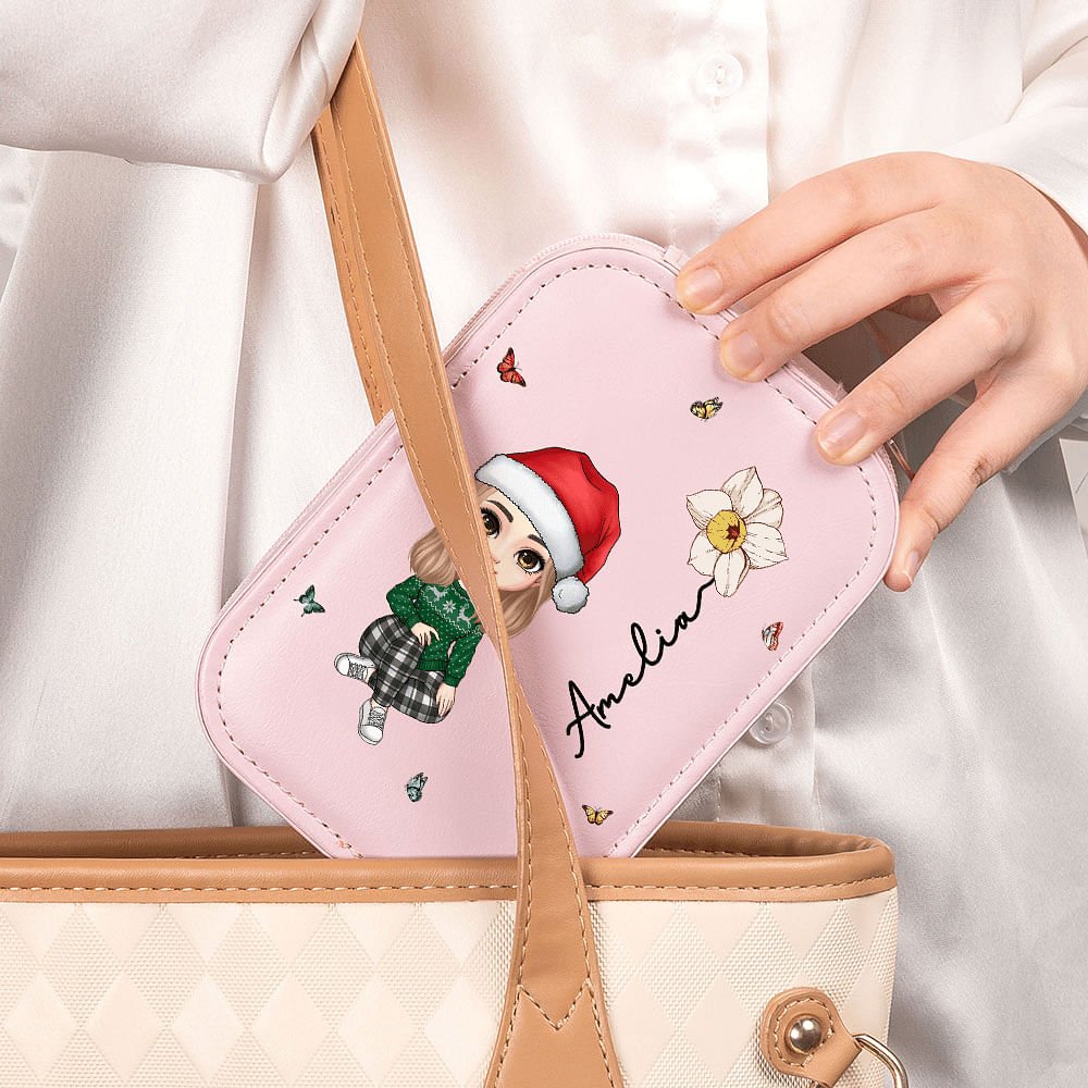 Cette boîte à bijoux est ornée d'une magnifique fleur de naissance et d'un personnage de dessin animé personnalisable, de la couleur de la coiffure au pull, etc. De plus, vous pouvez la personnaliser avec le nom de la personne à qui elle est destinée, ce qui en fait un objet unique. L'illustration multicolore ajoute une touche de fantaisie et de personnalité, faisant de cette boîte un accessoire remarquable pour n'importe quelle commode.