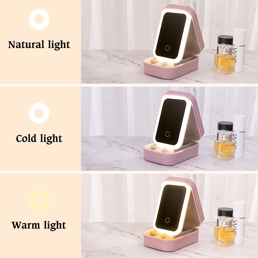 Cette boîte à bijoux est équipée d'un miroir LED avec trois réglages de couleur - lumière chaude, lumière naturelle et lumière froide - qui peuvent être utilisés pour créer différentes ambiances. Il est livré avec un câble de chargement, qui peut être utilisé pendant environ une semaine avec une seule charge. Que vous vous prépariez pour une soirée ou une journée décontractée, choisissez la lumière qui vous convient le mieux. Ce miroir pratique est parfait pour se maquiller et vérifier son look.