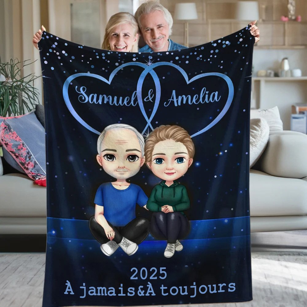 Cette couverture personnalisée représente un adorable couple de dessins animés, orné de deux cœurs entrelacés, qui peuvent être personnalisés avec les noms du couple. Sous les personnages, une année spéciale et un message personnel peuvent être ajoutés. Ce cadeau unique et significatif symbolise l’amour et la chaleur.