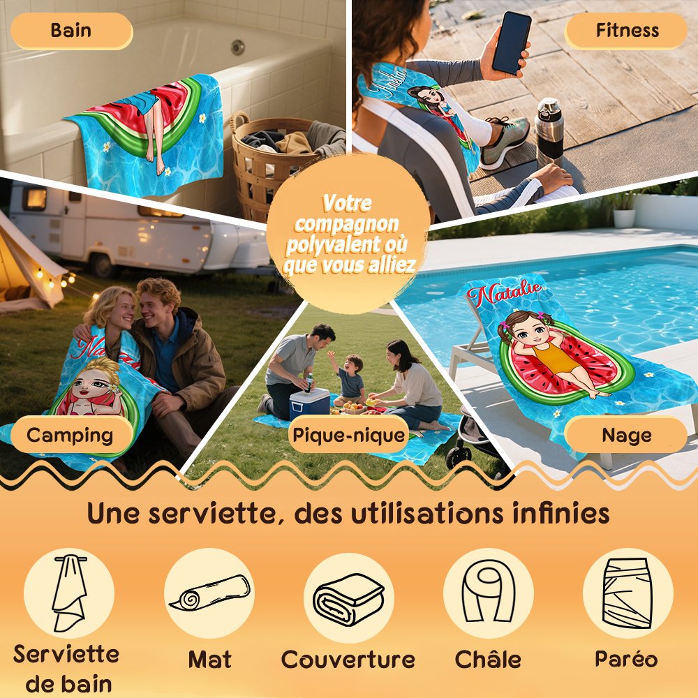 Cette serviette de plage personnalisée est un excellent cadeau pour les amateurs de natation, les amoureux des vacances à la plage, les membres de la famille et les amis qui adorent les activités estivales. Elle est parfaite pour les anniversaires d'été, les fêtes de plage, les départs en vacances, ou comme surprise attentionnée pour toute personne préparant un voyage sur la côte, en montrant son intérêt pour le soleil, le sable et les plaisirs de l'eau.