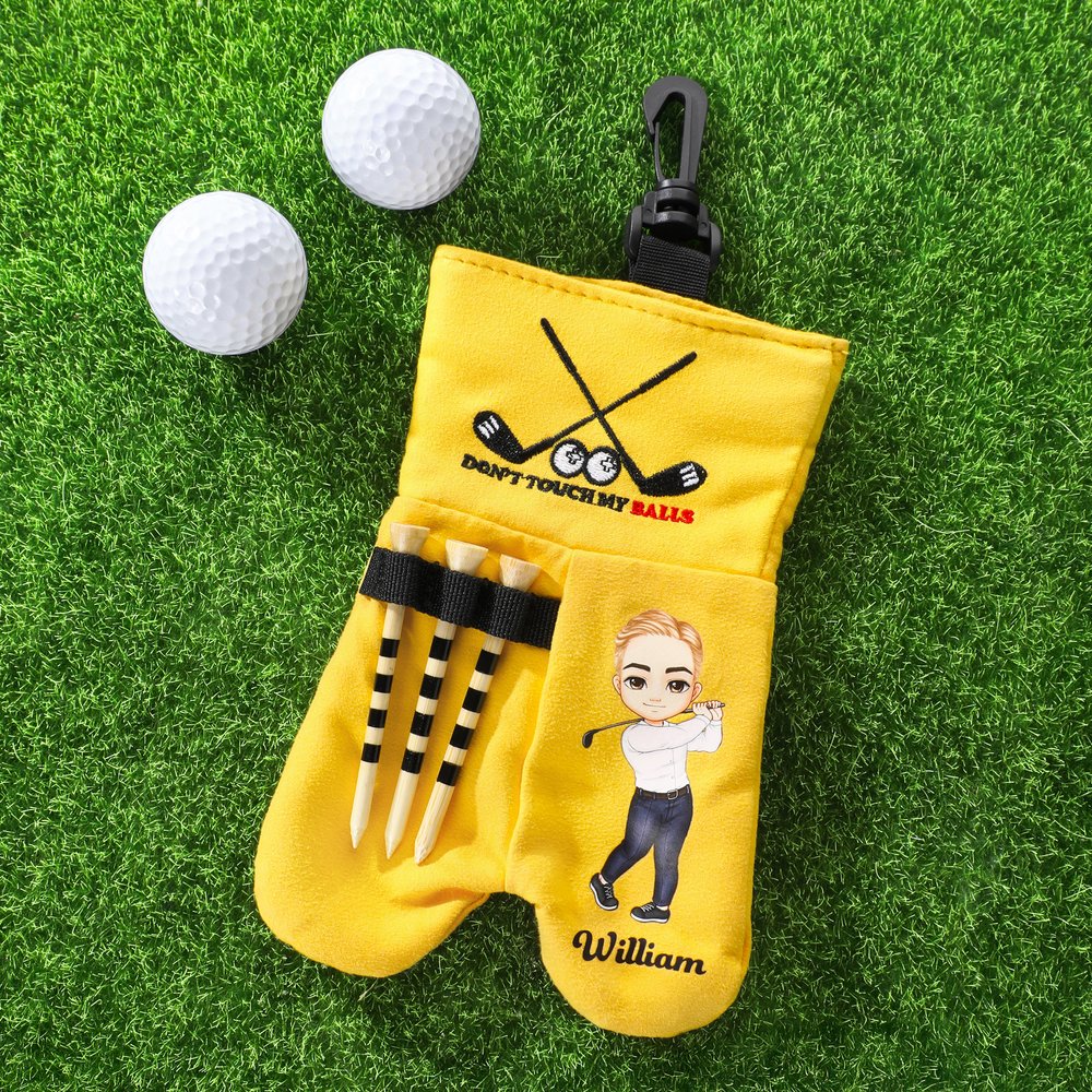 Ce sac à balles de golf est entièrement personnalisable. Vous pouvez choisir entre les couleurs café clair et jaune. Personnalisez ensuite les images de personnages de dessins animés brandissant un club de golf. Vous pouvez également ajouter un nom pour le rendre unique. Le texte "DON'T TOUCH MY BALLS" ajoute une touche amusante, rendant chaque sac unique.