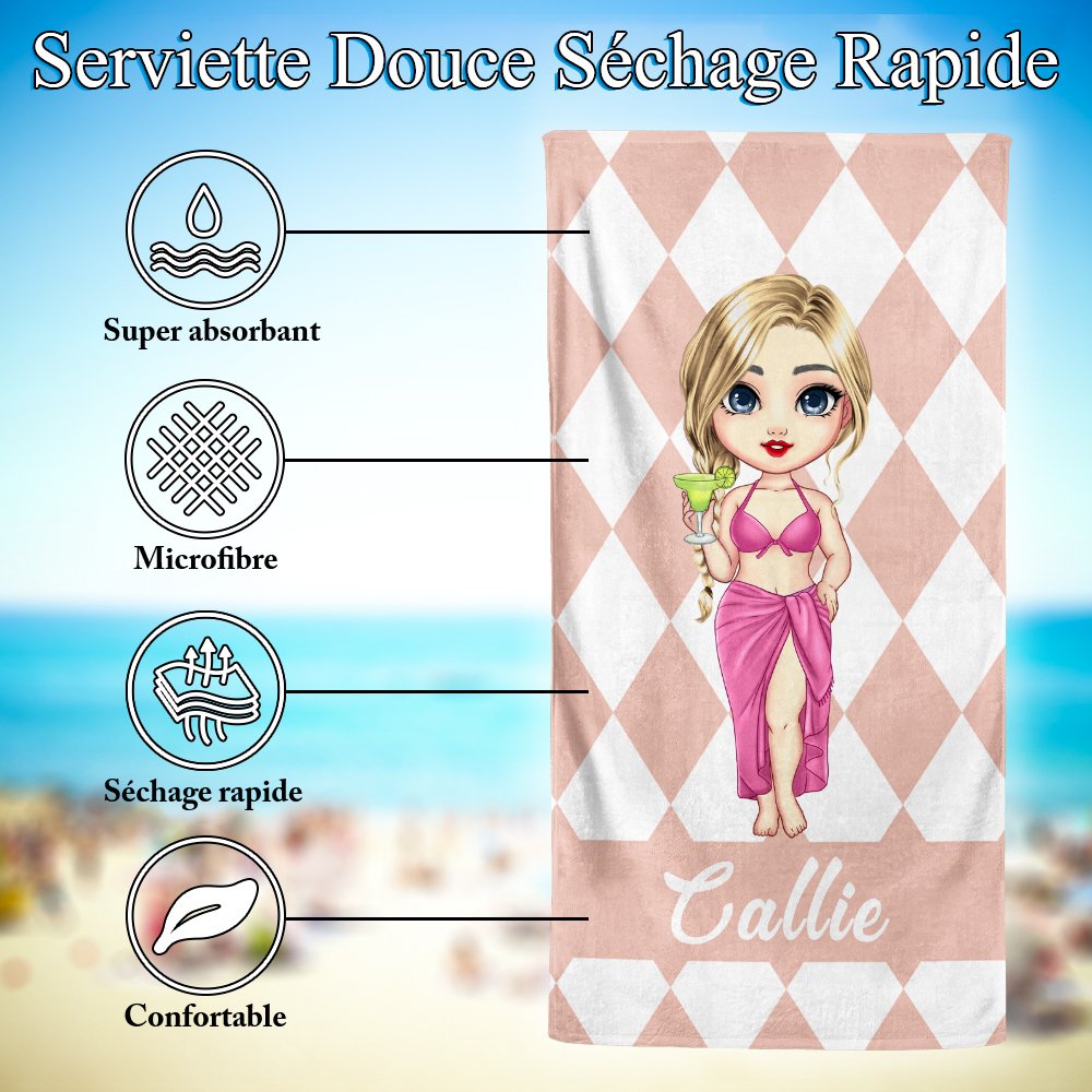 Ces serviettes de plage présentent de charmants dessins de personnages de dessins animés qui peuvent être personnalisés avec votre propre image de personnage de dessins animés. Elles sont disponibles dans une variété de motifs de couleurs à rayures et à carreaux, ce qui leur confère un style unique et excentrique. Chaque serviette de plage peut être personnalisée avec un nom pour se démarquer à la plage ou à la piscine.