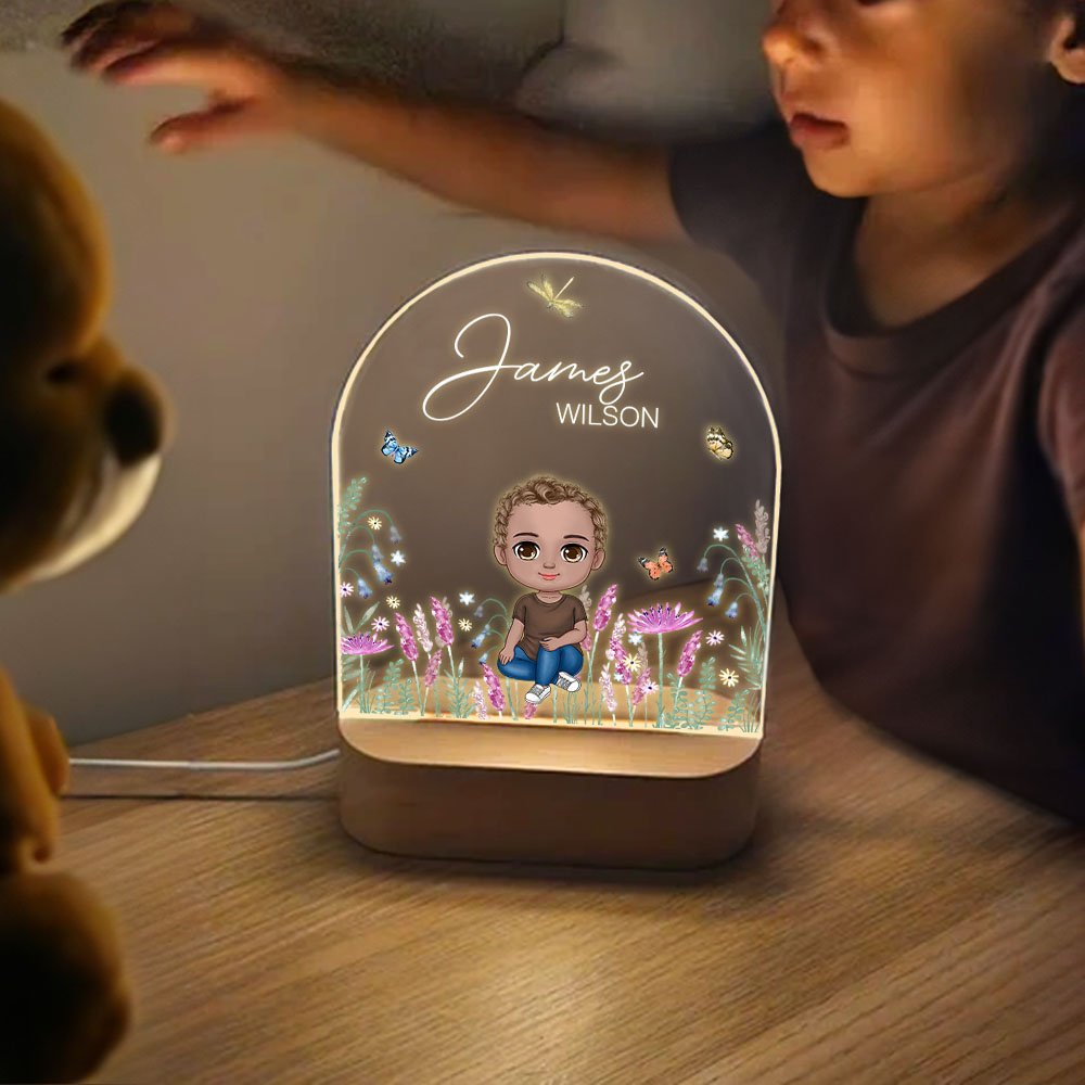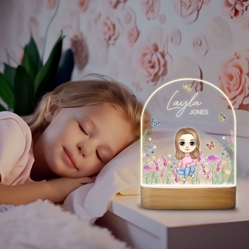 Notre veilleuse présente un adorable personnage de dessin animé personnalisé niché au milieu de fleurs éclatantes, créant ainsi une atmosphère fantaisiste et rêveuse. Personnalisez-la avec votre nom pour une addition unique à votre chambre à coucher.