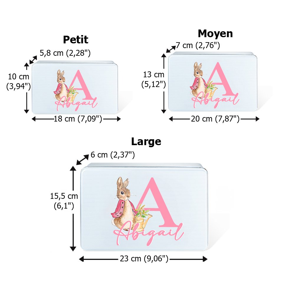 La boîte en fer est ornée d'un mignon motif de Pierre Lapin. Vous avez le choix entre quatre couleurs de lapin (rose, bleu, rouge et vert), qui exhalent le charme unique de Pâques. Vous pouvez personnaliser vos initiales et votre nom pour les incorporer subtilement au motif et le rendre encore plus unique.