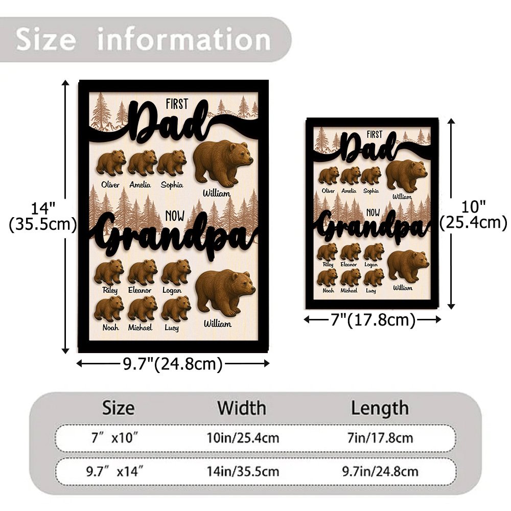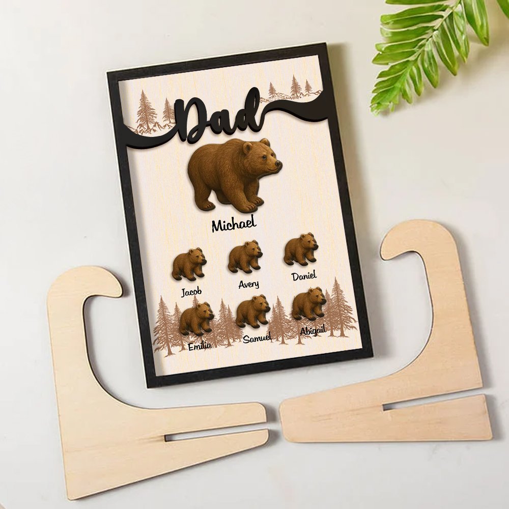 Ce cadre en bois représente une adorable famille d'ours de dessin animé sur fond de cèdre, avec une scène d'amour entre un papa ours et ses petits. Personnalisez jusqu'à 22 ours pour représenter chaque membre de la famille. Choisissez parmi deux styles ravissants pour répondre à vos préférences.