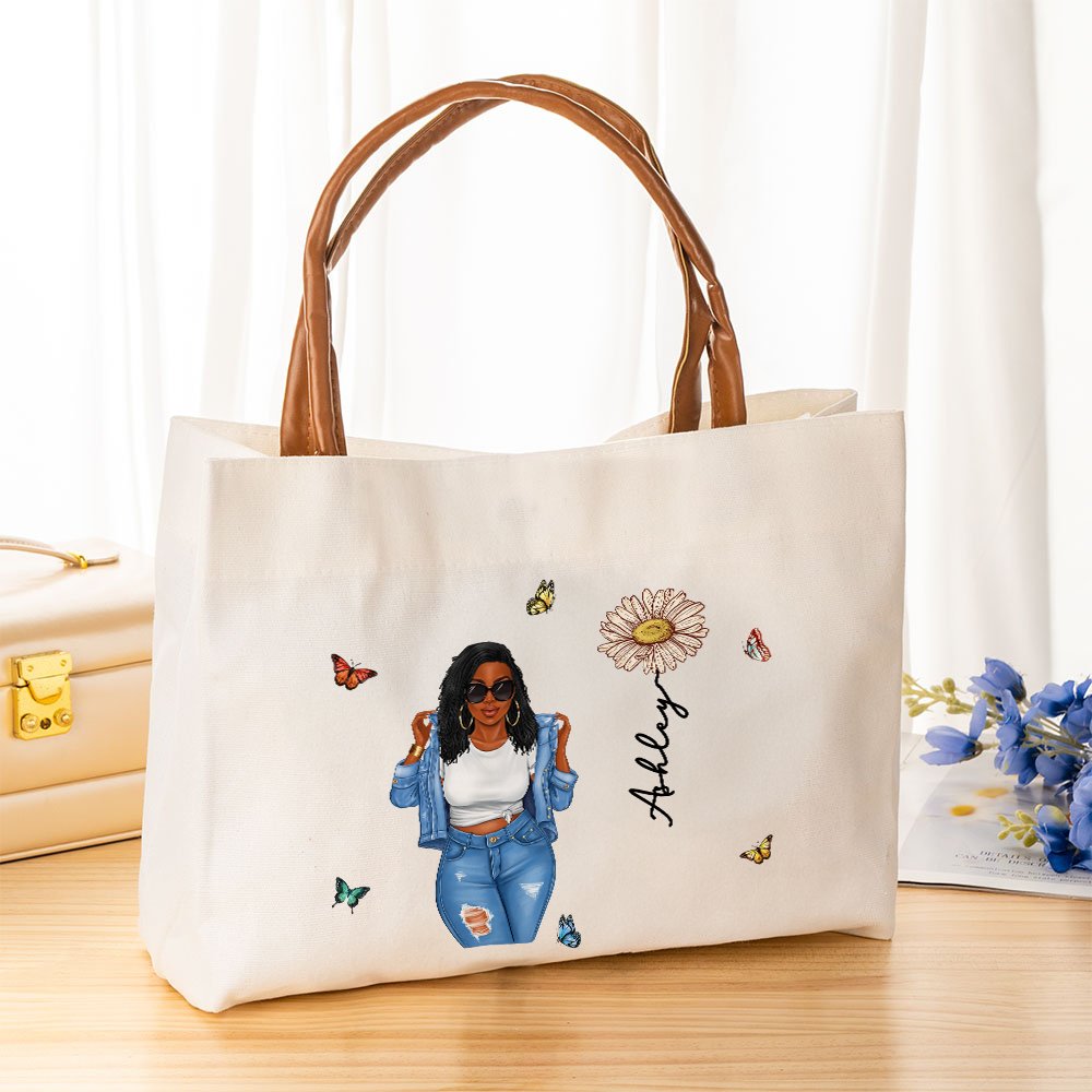 Ce sac fourre-tout représente une femme de bande dessinée dans une tenue en jean élégante, faisant preuve d'assurance et de vitalité. Elle est entourée de fleurs d'anniversaire et de motifs de papillons, et associée à un nom personnalisable, ce qui ajoute un sentiment d'exclusivité et d'amusement.