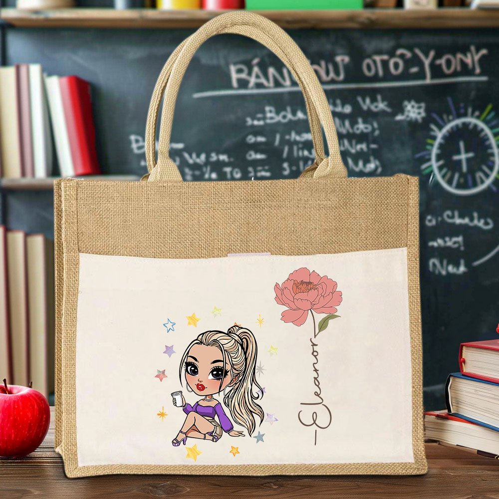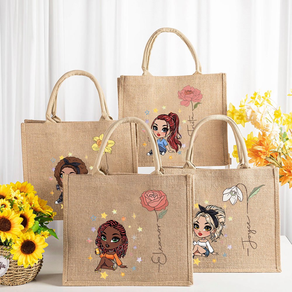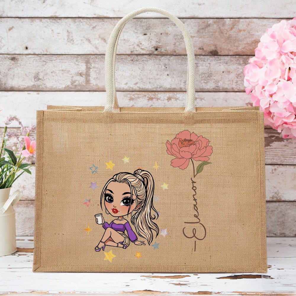 Ce sac fourre-tout est orné d'une charmante fleur de naissance et d'un dessin animé de jeune fille à la mode. Vous pouvez le personnaliser, du rouge à lèvres à la couleur de la coiffure et bien plus encore, en alliant l'espièglerie au style. C'est un cadeau unique qui reflète le style du destinataire.