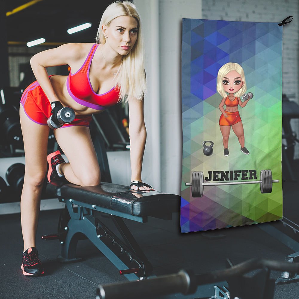 Cette serviette de sport super absorbante présente l'image animée et ludique d'une femme en pleine forme, ce qui vous permet de personnaliser le motif avec votre propre nom dans 9 styles de police différents et 10 options de couleurs vives.