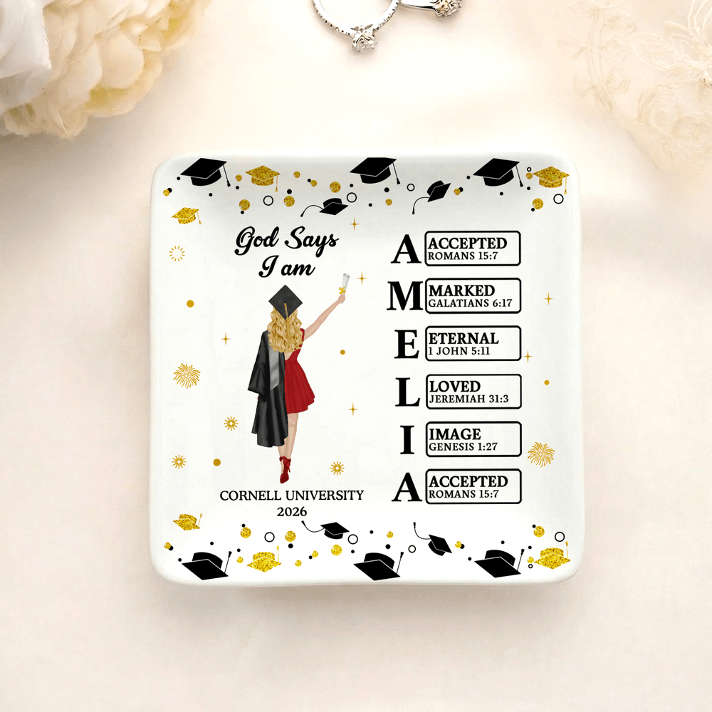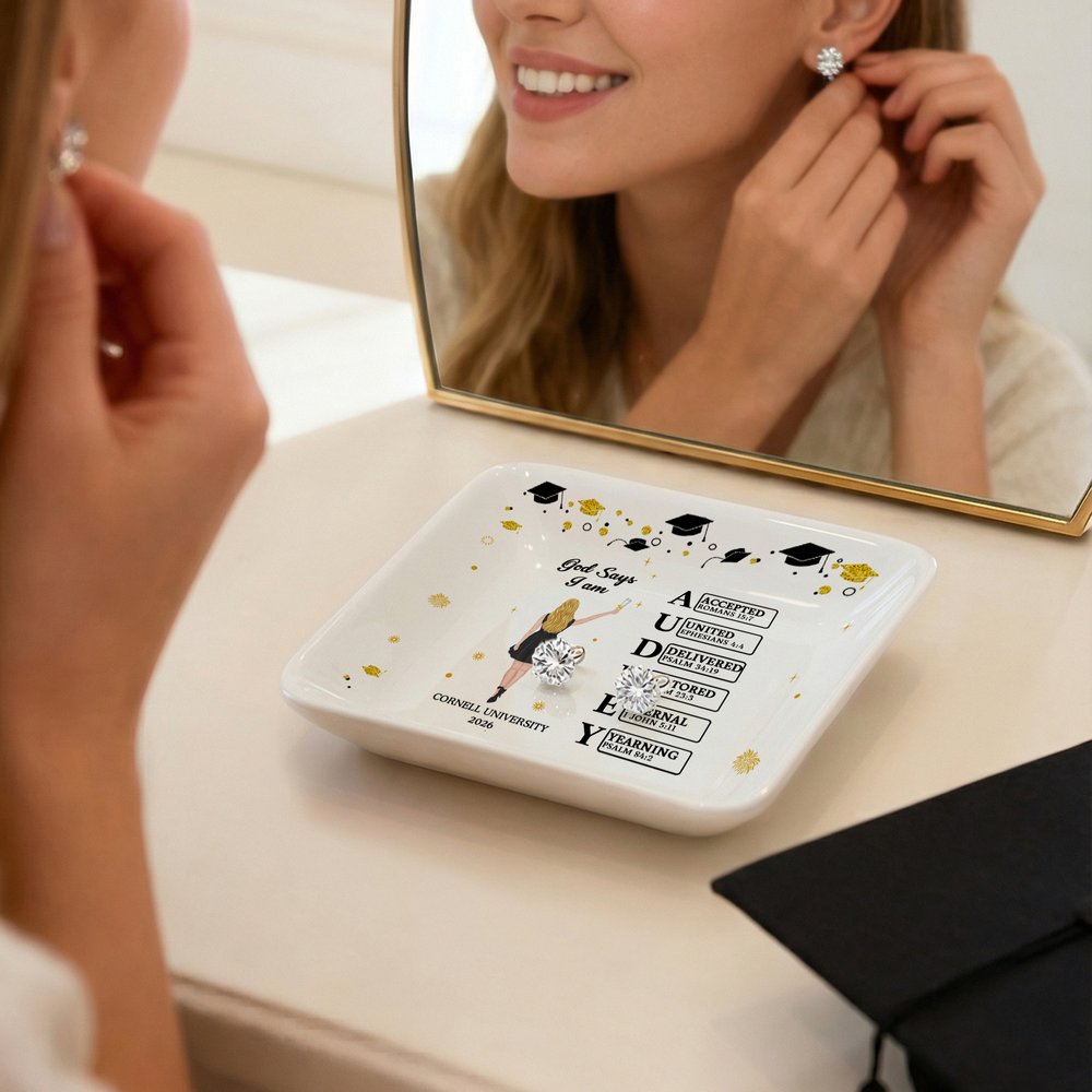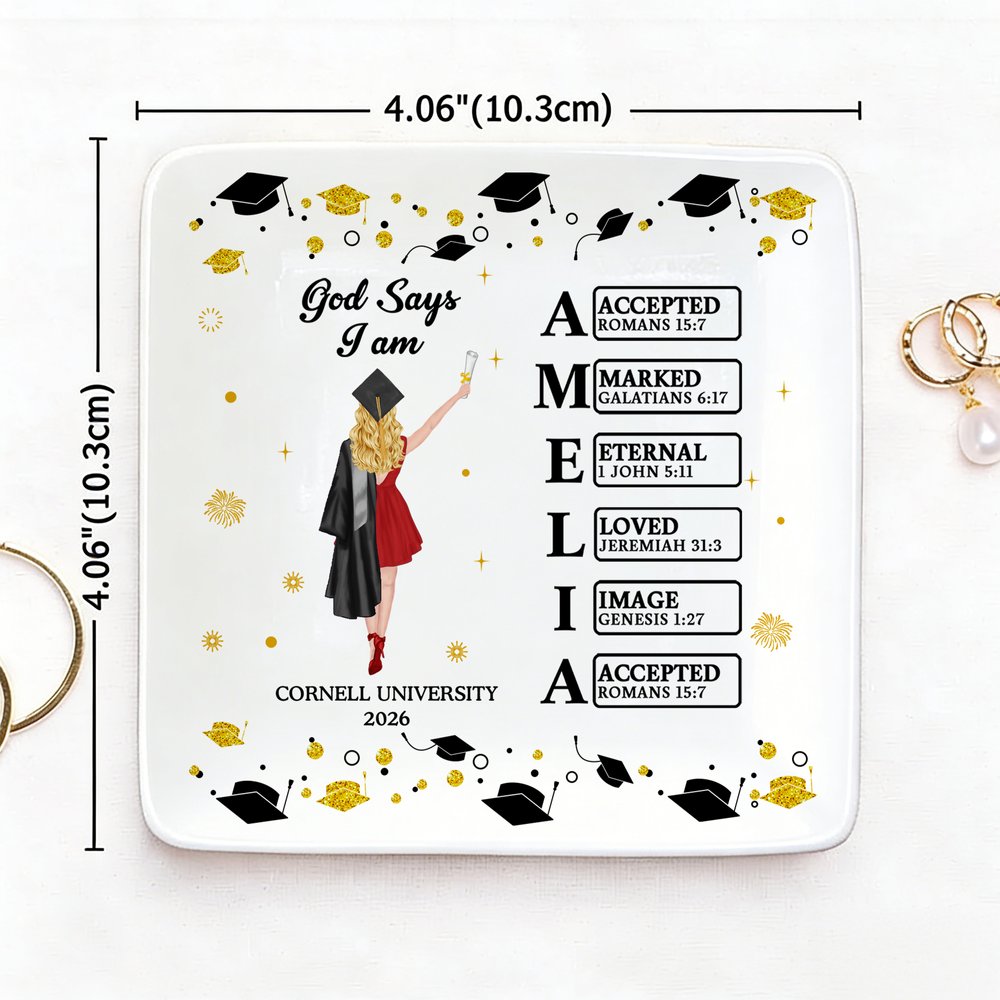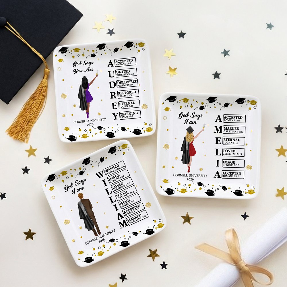 Ce plat à bijoux représente un diplômé, mettant parfaitement en valeur son style et ses réalisations. Les noms personnalisables intègrent des éléments de messages bibliques, imprégnant chaque mot de votre nom de la bénédiction de Dieu, créant ainsi un souvenir unique et significatif pour commémorer votre étape académique.