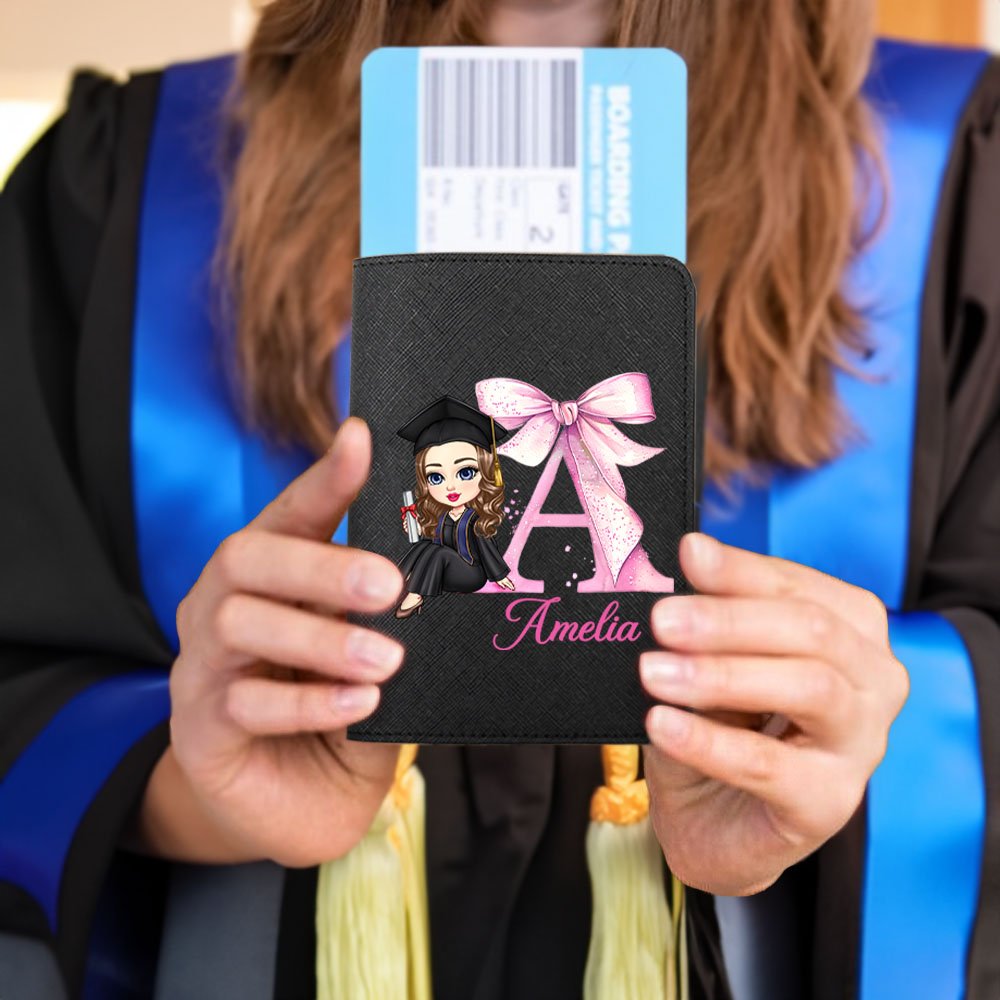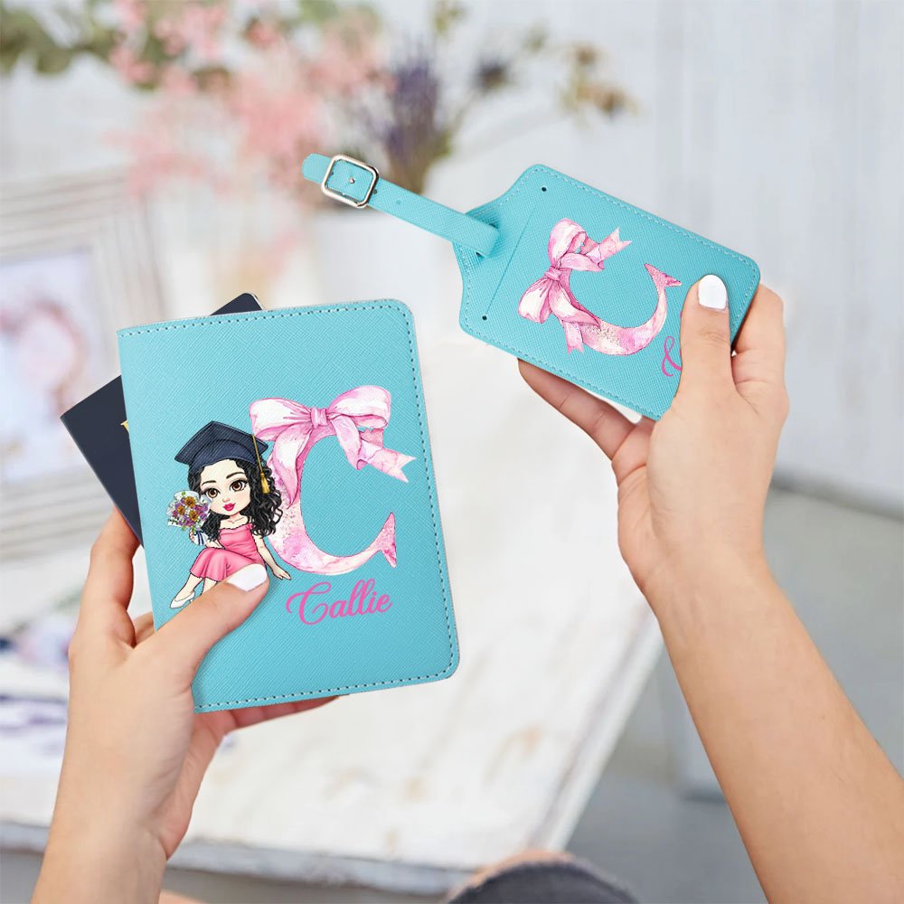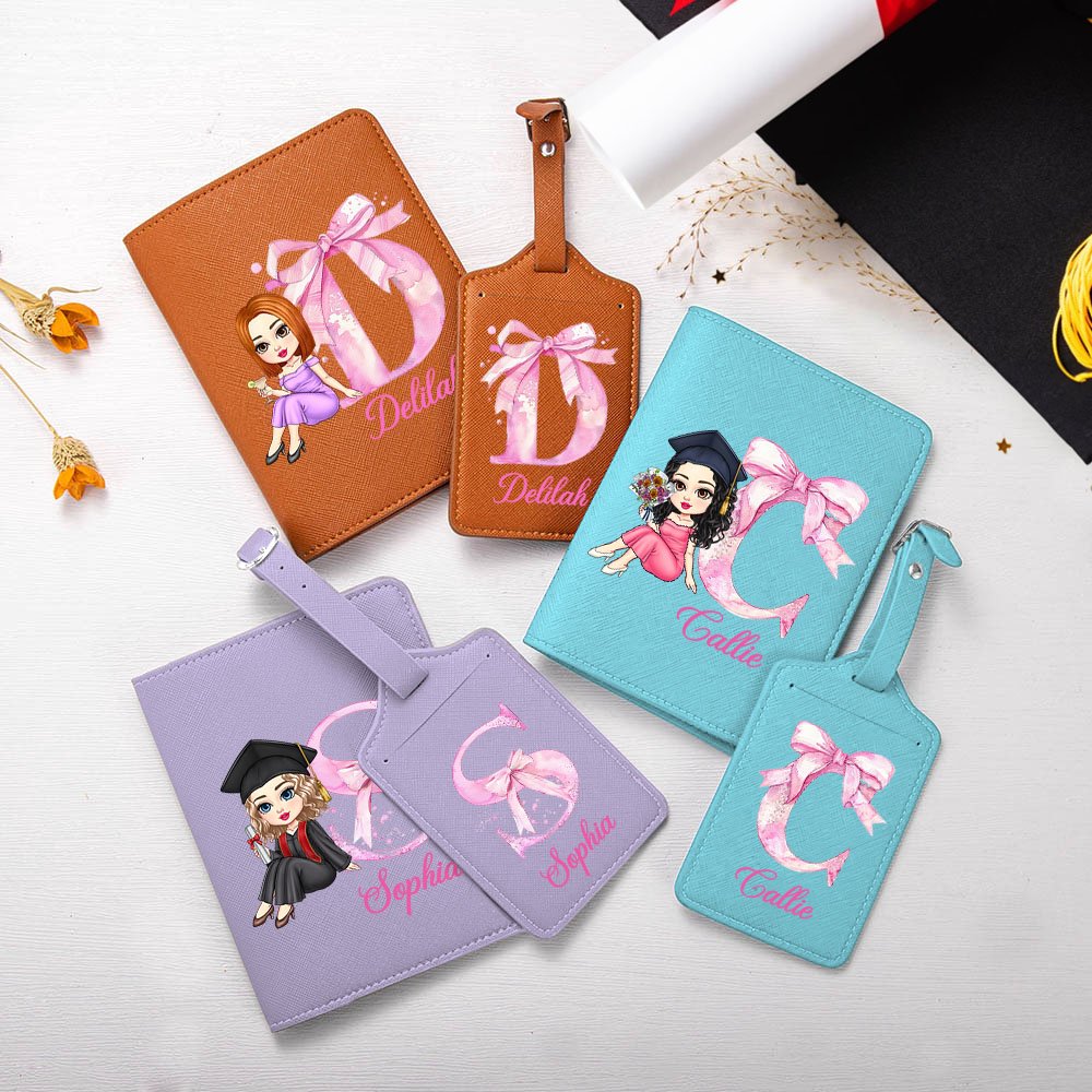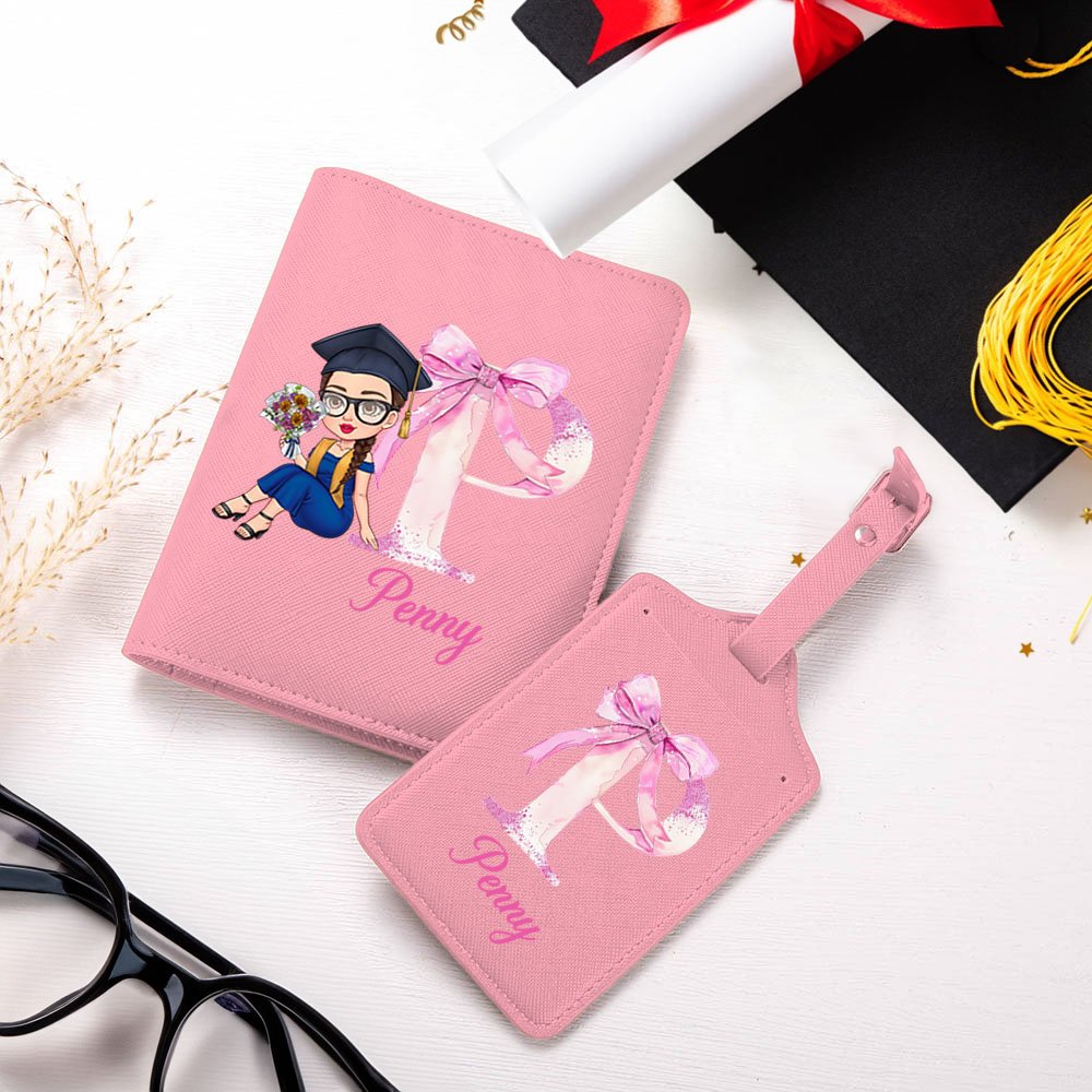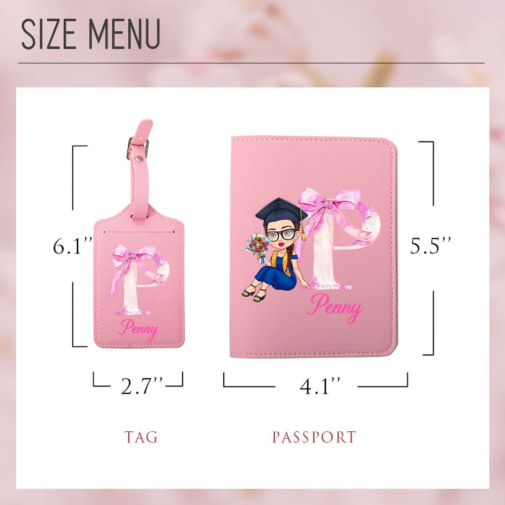 Ce porte-passeport et étiquette de bagage permet à chaque fille de choisir sa tenue de fin d'études préférée, y compris les robes de fin d'études et les robes, montrant ainsi parfaitement son style et ses réalisations. Les initiales en forme de nœud rose rendent ce cadeau encore plus personnalisé. Chaque fille peut avoir son image unique, symbolisant le moment important de sa remise de diplôme et son brillant avenir.