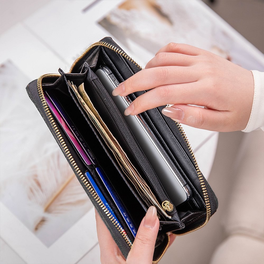 Le portefeuille dispose au total de 12 fentes pour cartes de crédit, de 3 fentes pour argent liquide et d'une fermeture à glissière intégrée pour les pièces de monnaie. Il permet de ranger facilement les cartes bancaires, les cartes de visite, l'argent liquide et d'autres petits objets, évitant ainsi les recherches fastidieuses.