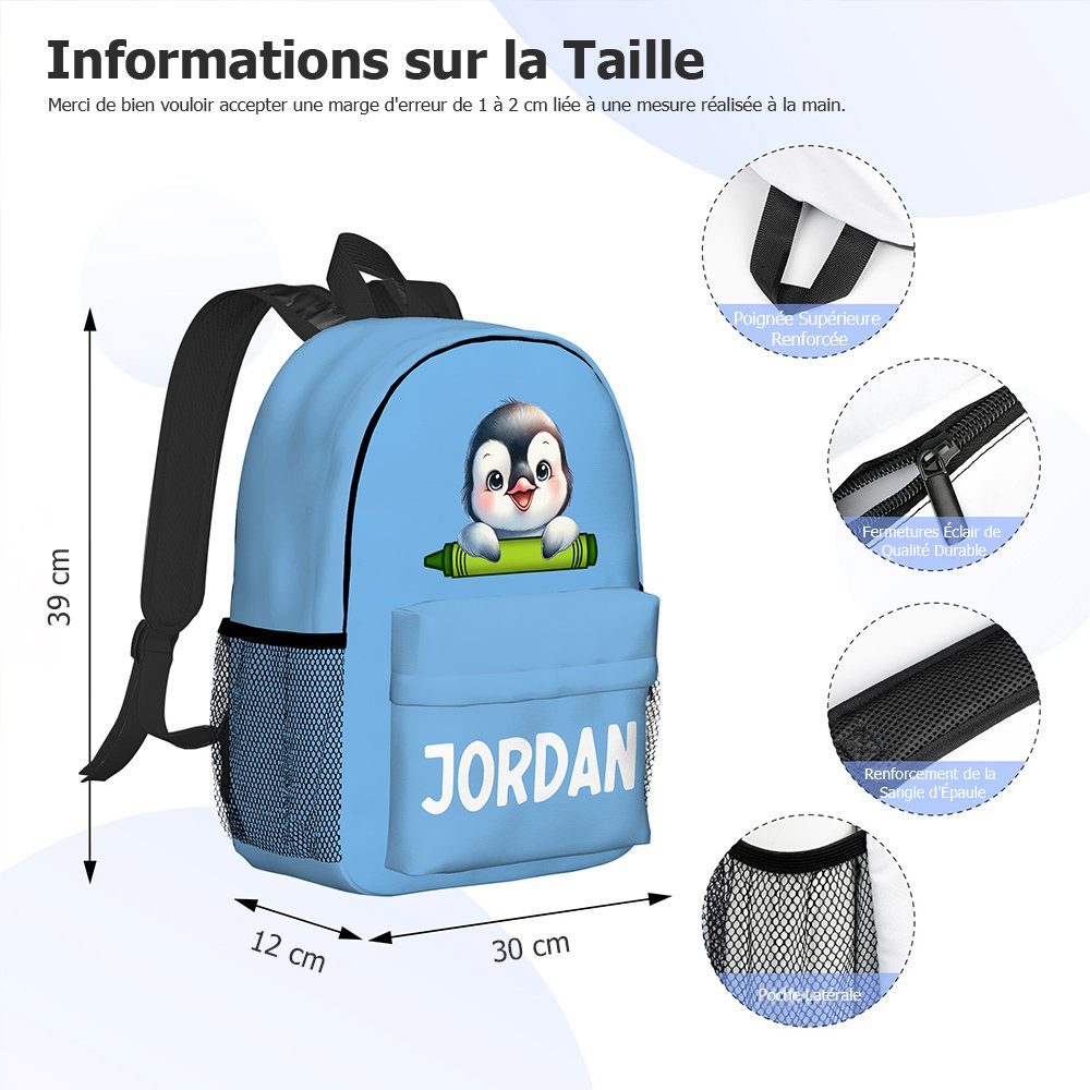 Ce sac à dos se distingue par un adorable animal de bande dessinée qui fait des câlins aux crayons, associé à 16 options de couleur pour faire de votre enfant le centre d'attention à l'école. Avec des animaux charmants comme les pingouins, les écureuils et les ours, il stimule l'imagination et la curiosité des enfants. Personnalisez-le en choisissant l'un des trois styles de police pour le nom de votre enfant, transformant ainsi chaque sac à dos en une pièce unique qui reflète son individualité.
