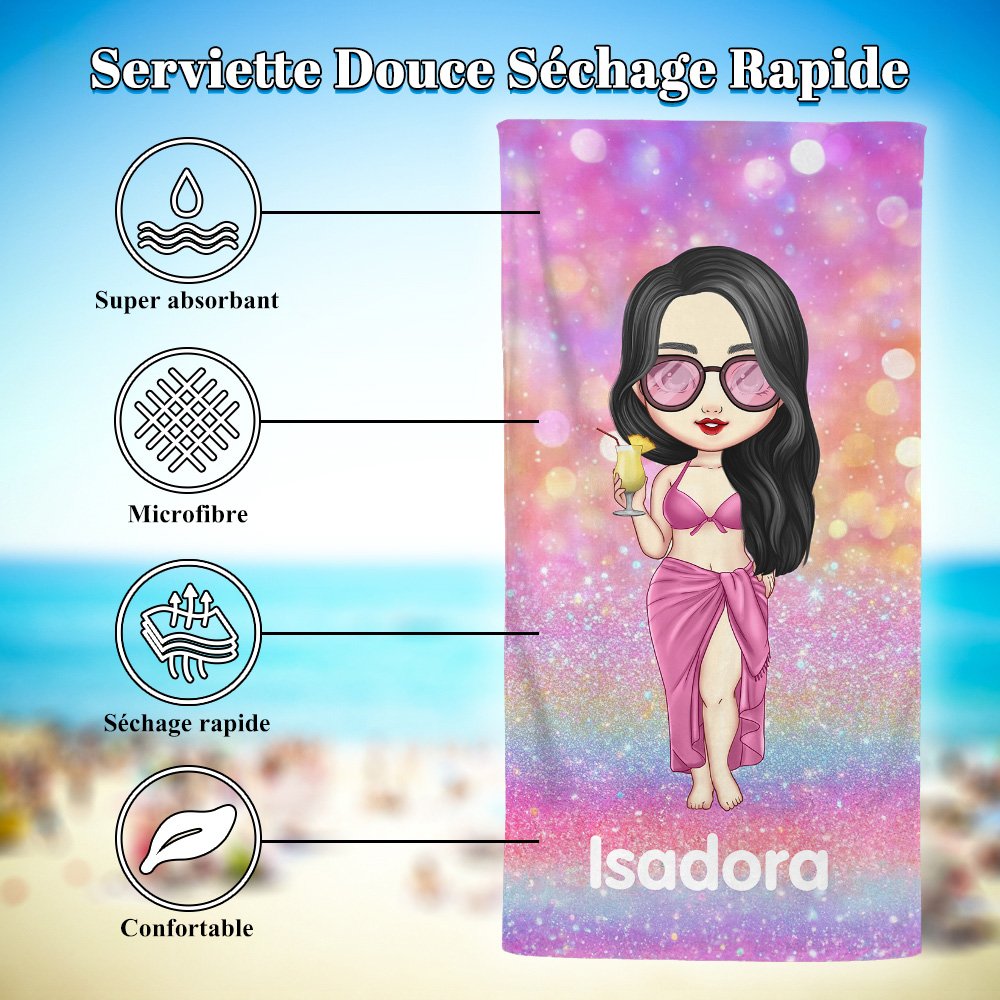 Cette serviette de plage est décorée d'un personnage de dessin animé représentant une femme et une fille, et peut être personnalisée avec le nom du destinataire, ajoutant ainsi une touche personnelle et originale à ses moments à la plage. Avec 25 paillettes scintillantes en toile de fond, elle fait un cadeau fun et affectueux pour les enfants, ou un joli présent pour les adultes.