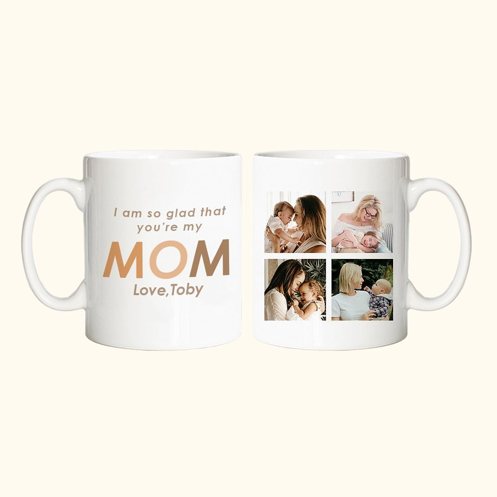 L'avant du mug est conçu avec un texte en anglais simple, vous pouvez ajouter ce que vous voulez dire sur la paroi du mug en céramique blanche impeccable, avec le design de la police de couleur dégradée pour rendre le texte plus unique et romantique. Le dos du mug comporte une photo à quatre panneaux, pour que vous puissiez télécharger une photo de vous et de votre mère afin d'immortaliser un beau moment.